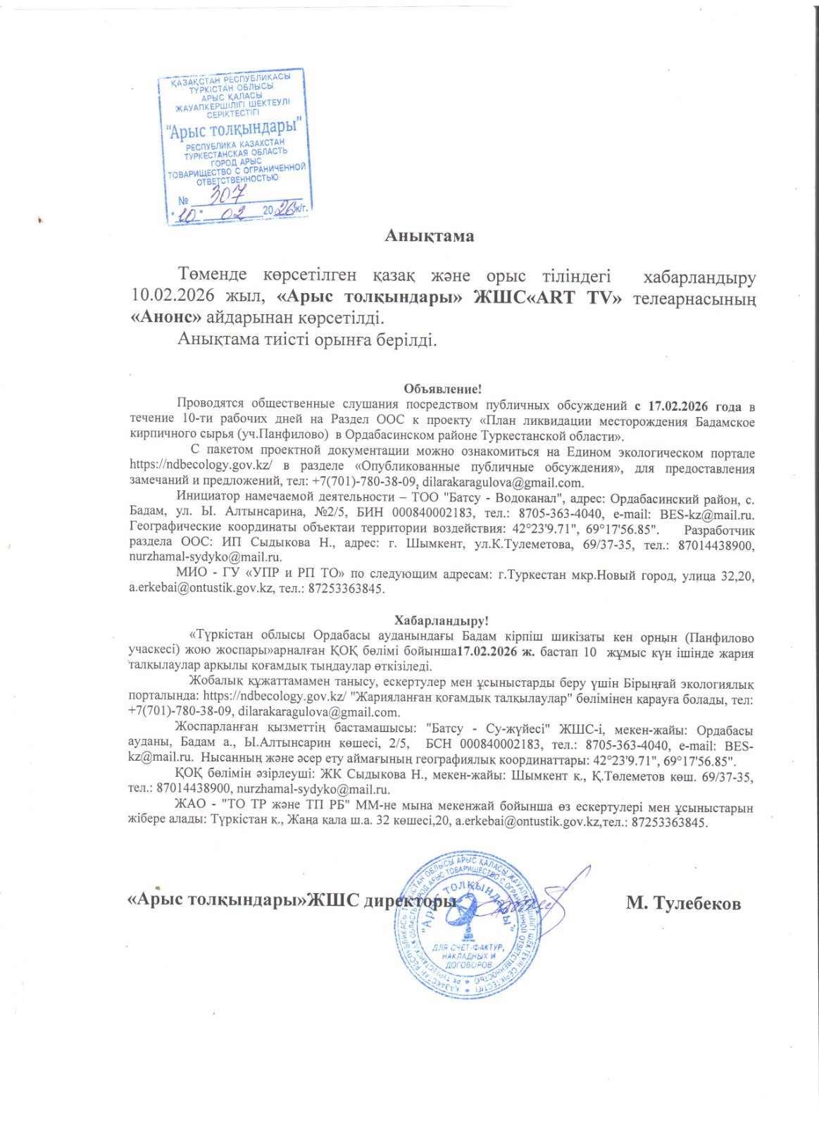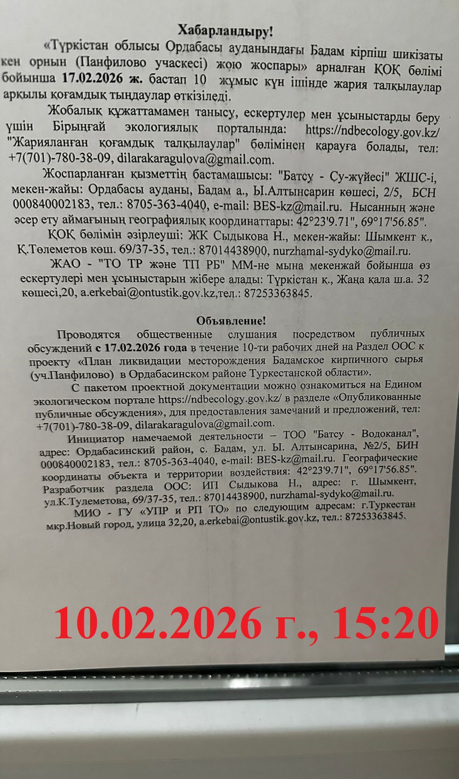 По проекту: Раздел ООС к проекту «План ликвидации месторождения Бадамское кирпичного сырья (уч.Панфилово) в Ордабасинском районе Туркестанской области»