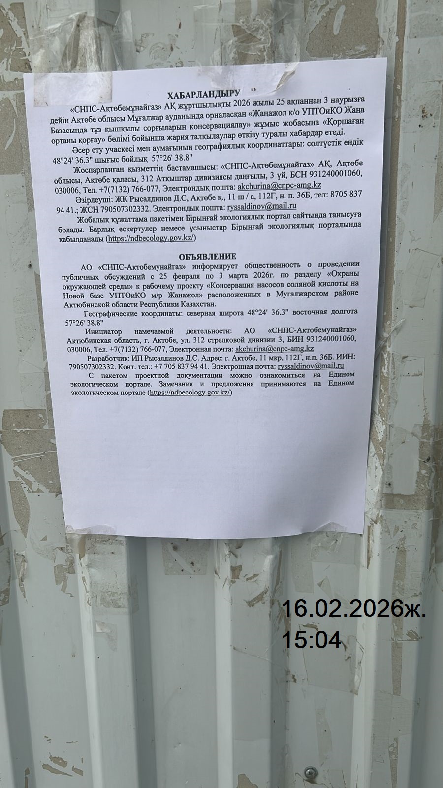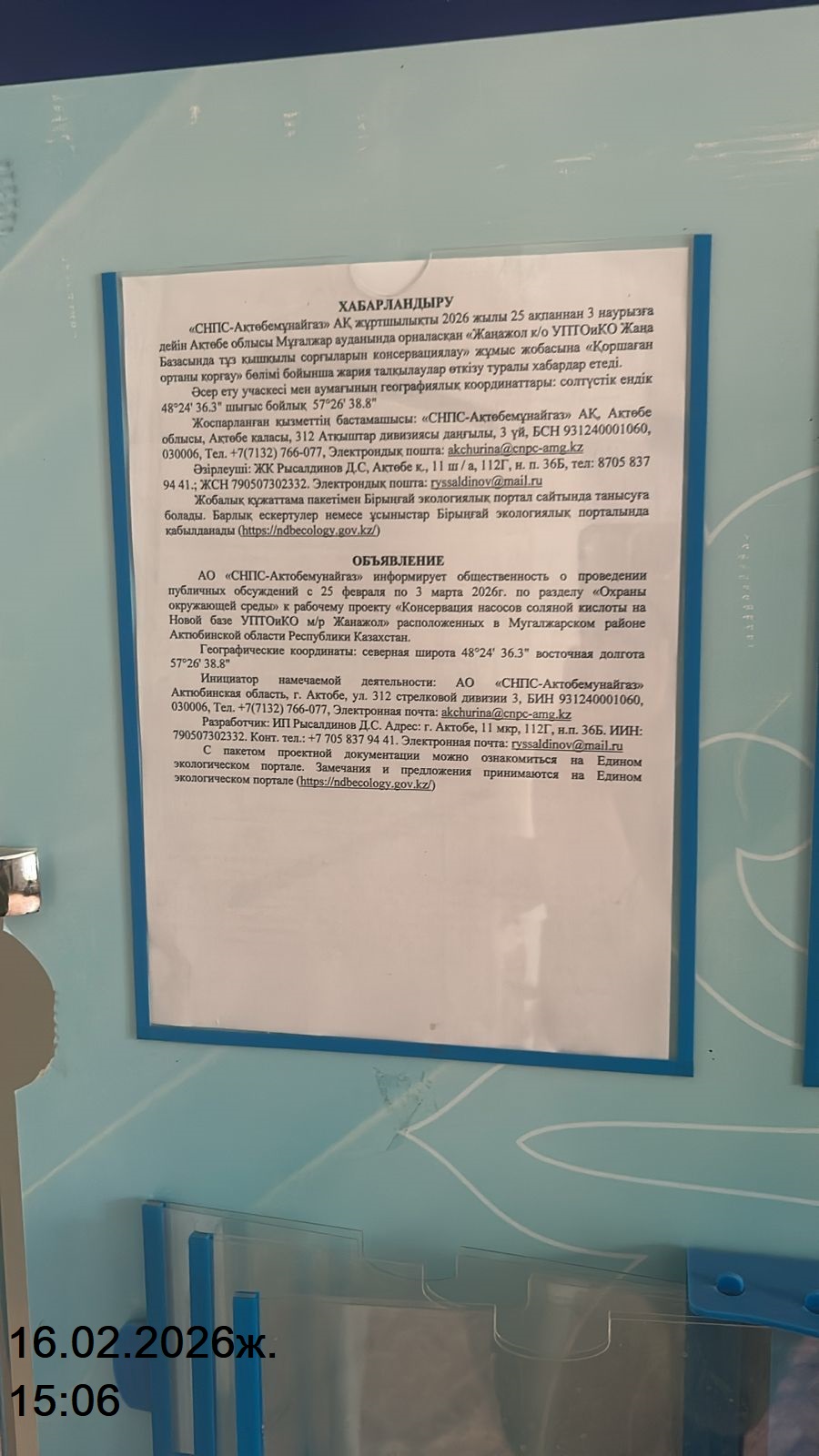 По проекту: Раздел «Охраны окружающей среды» к рабочему проекту «Консервация насосов соляной кислоты на Новой базе УПТОиКО м/р Жанажол»