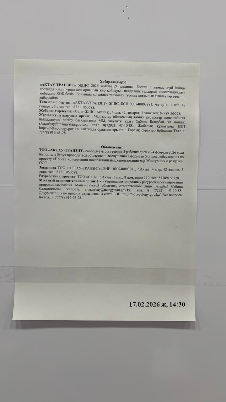 По проекту: Раздел охраны окружающей среды к «Проект консервации последствий недропользования месторождения Жангурши»