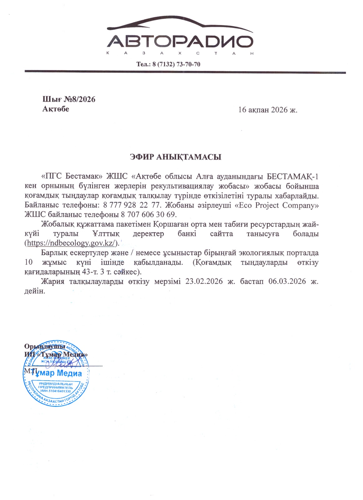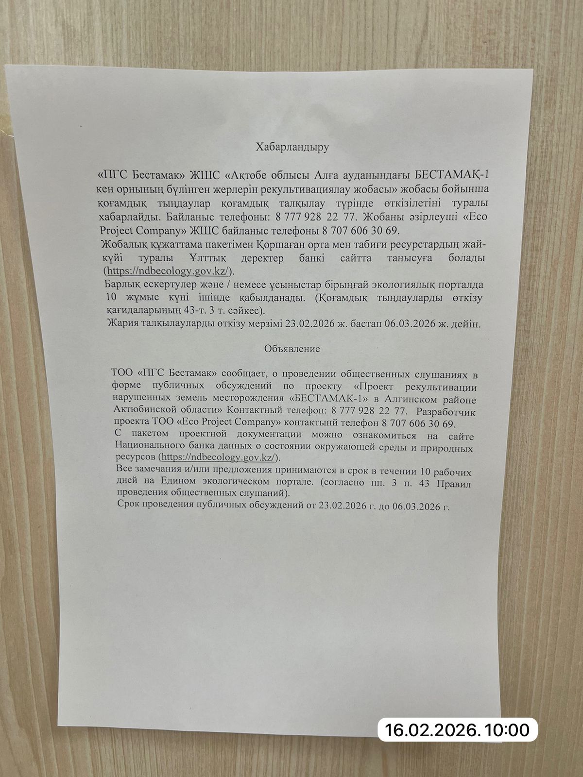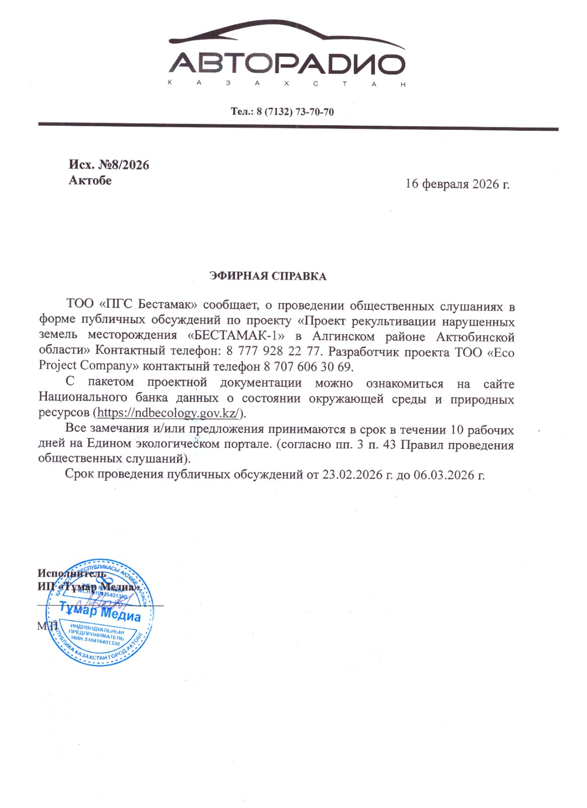 По проекту: РАЗДЕЛ охраны окружающей среды к Рабочему проекту «Проект рекультивации нарушенных земель месторождения «БЕСТАМАК-1» в Алгинском районе Актюбинской области»