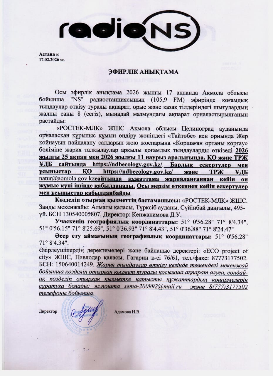 По проекту: Раздел «Охрана окружающей среды» на Проект плана ликвидации последствий недропользования на месторождении Тайтобе по добыче строительного песка расположенного в Целиноградском районе Акмолинской области