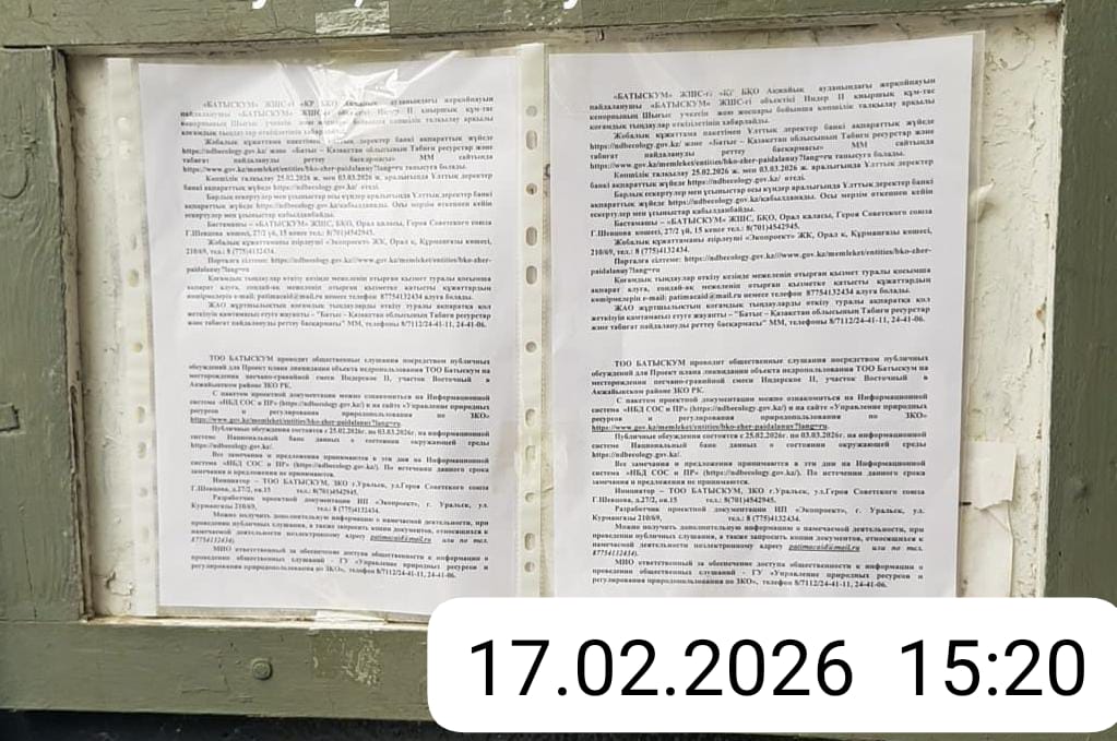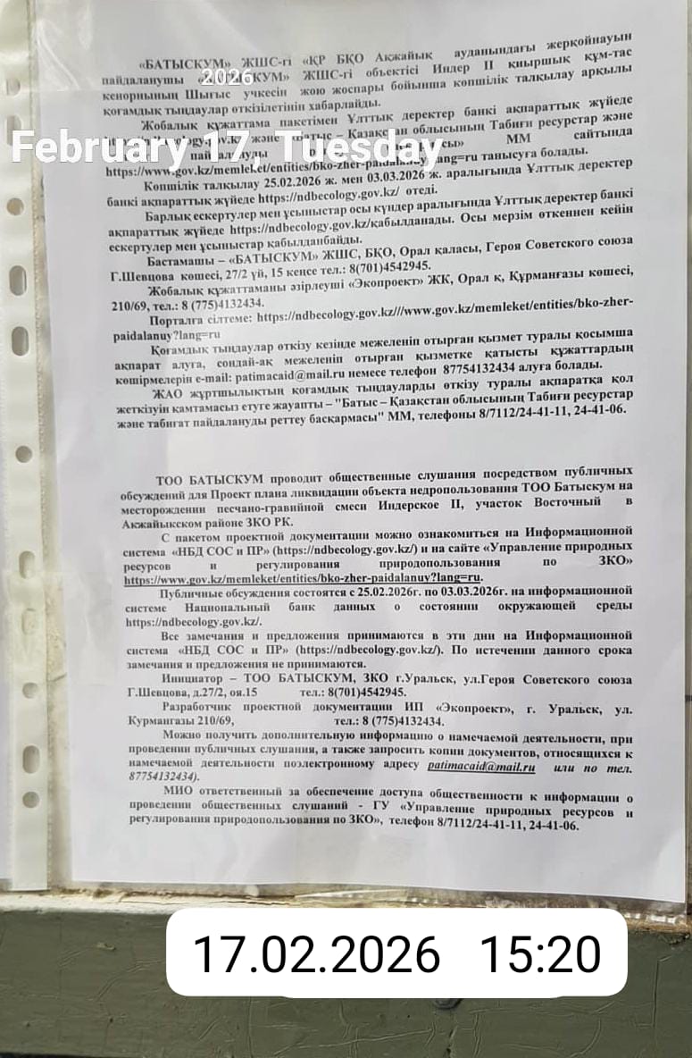 По проекту: Плана ликвидации объекта недропользования ТОО «Батыскум» на месторождении песчано-гравийной смеси «Индерское II, участок Восточный» в Акжаикском районе Западно-Казахстанской области Республики Казахстан