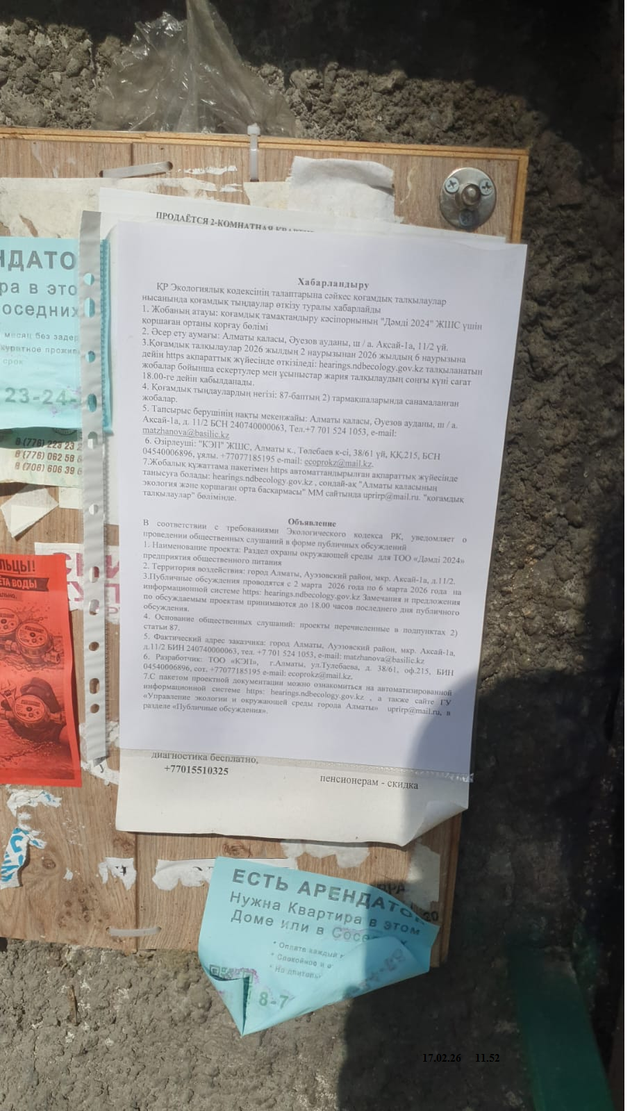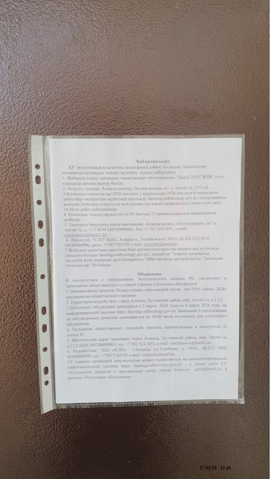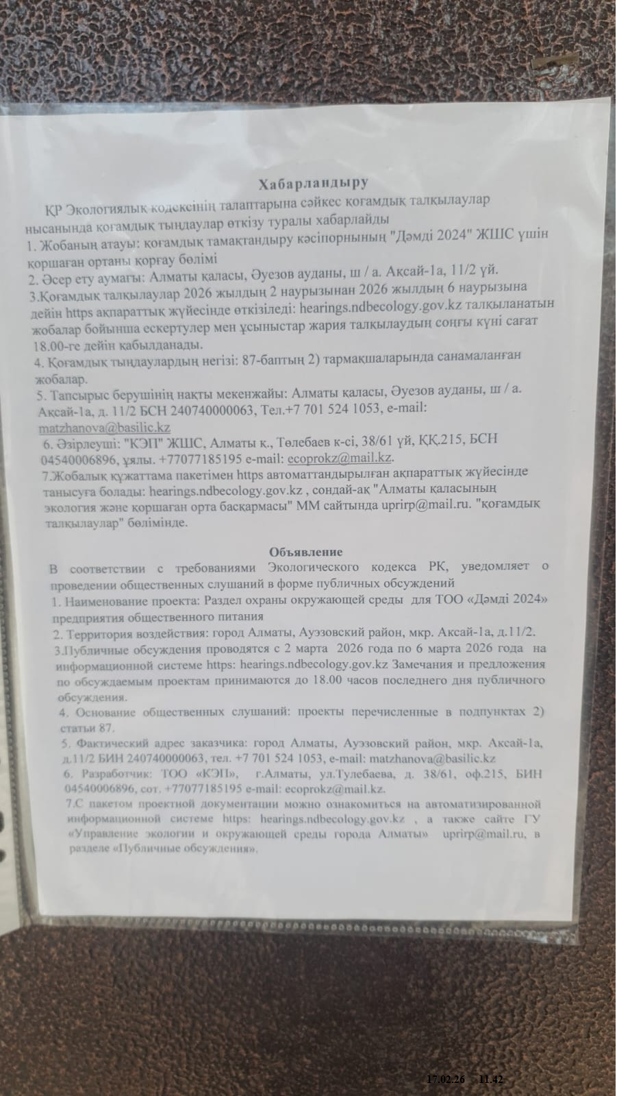 По проекту: РАЗДЕЛ «ОХРАНА ОКРУЖАЮЩЕЙ СРЕДЫ» ДЛЯ ТОВАРИЩЕСТВА С ОГРАНИЧЕСКОЙ ОТВЕТСТВЕННОСТЬЮ «Дәмді 2024» (предприятия общественного питания (столовая, кулинария, пиццерия и пр.)) РАСПОЛОЖЕННОГО ПО АДРЕСУ: Алматы, Ауэзовский район, мкр. Аксай-1а, д.11/2