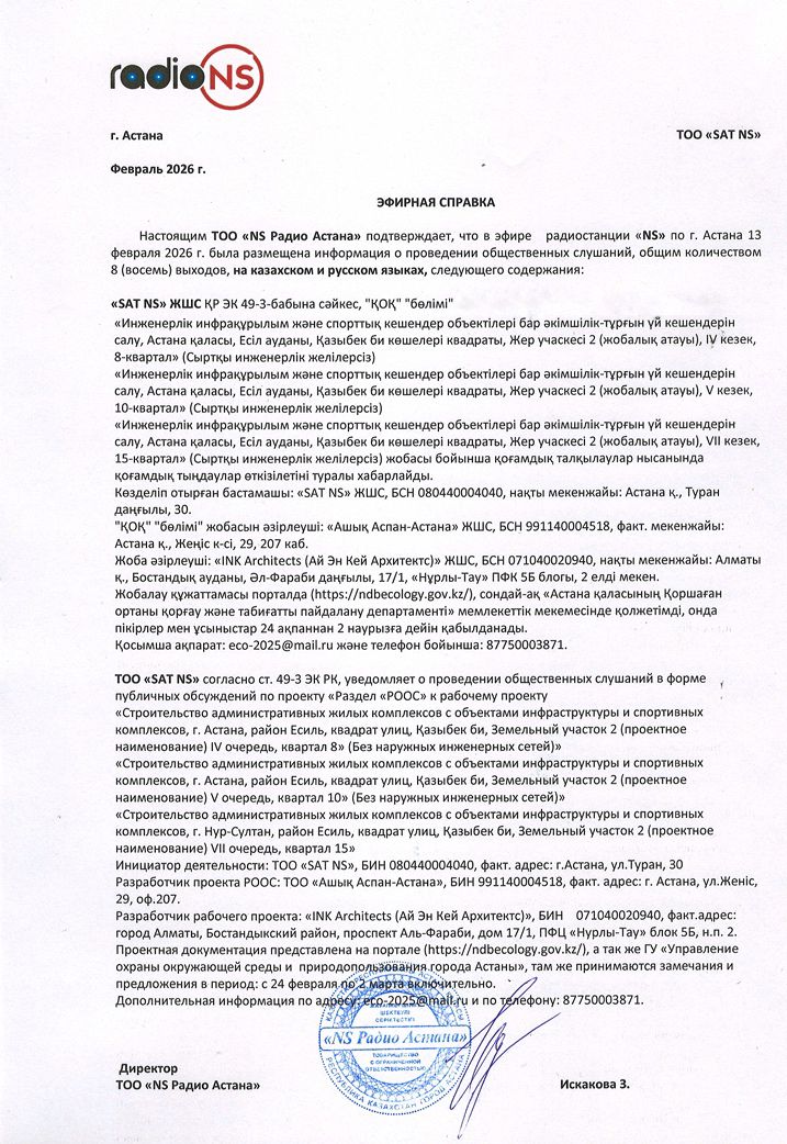По проекту: «Строительство административных жилых комплексов с объектами инфраструктуры и спортивных комплексов, г. Астана, район Есиль, квадрат улиц, Қазыбек би, Земельный участок 2 (проектное наименование) IV очередь, квартал 8» (Без наружных инженерных сетей)» «Строительство административных жилых комплексов с объектами инфраструктуры и спортивных комплексов, г. Астана, район Есиль, квадрат улиц, Қазыбек би, Земельный участок 2 (проектное наименование) V очередь, квартал 10» (Без наружных инженерных сетей)» «Строительство административных жилых комплексов с объектами инфраструктуры и спортивных комплексов, г. Нур-Султан, район Есиль, квадрат улиц, Қазыбек би, Земельный участок 2 (проектное наименование) VII очередь, квартал 15»