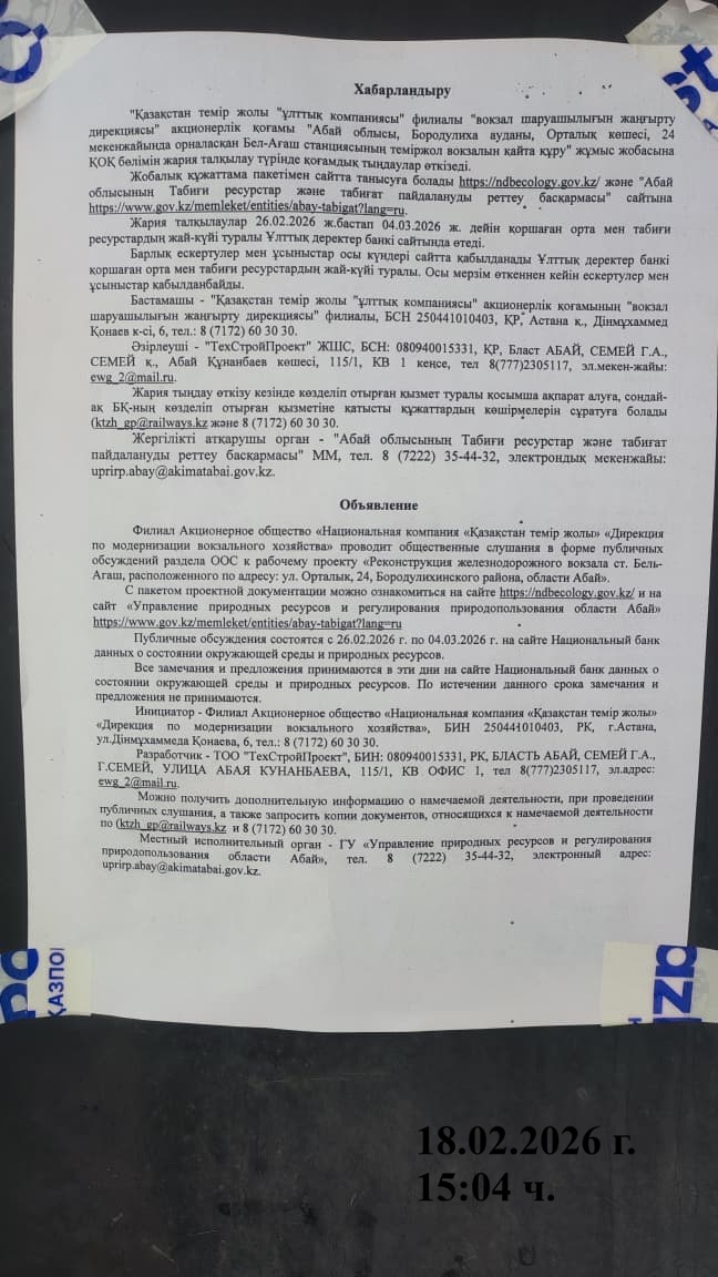 По проекту: «Реконструкция железнодорожного вокзала ст. БельАгаш, расположенного по адресу: ул. Орталык, 24, Бородулихинского района, области Абай»