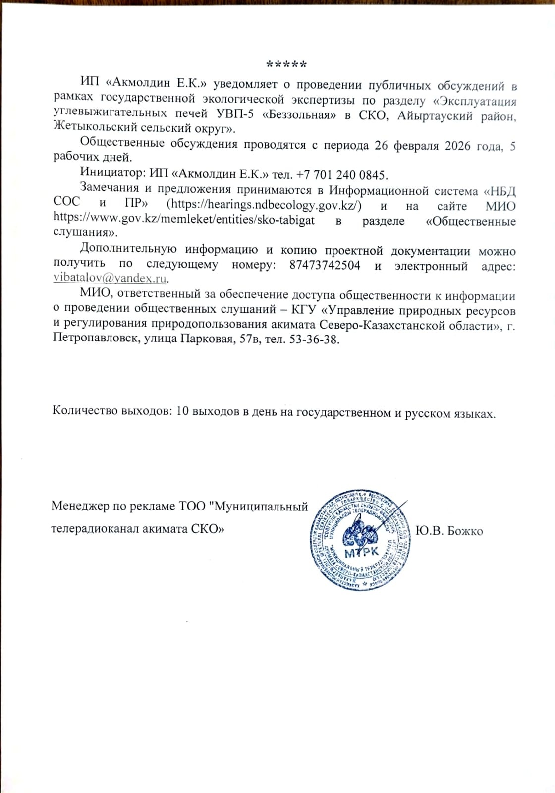 По проекту: Раздел «Охрана окружающей среды» по эксплуатации углевыжигательных печей УПГ-5 «Беззольная» в СКО, Айыртауский район, Жетыкольский сельский округ