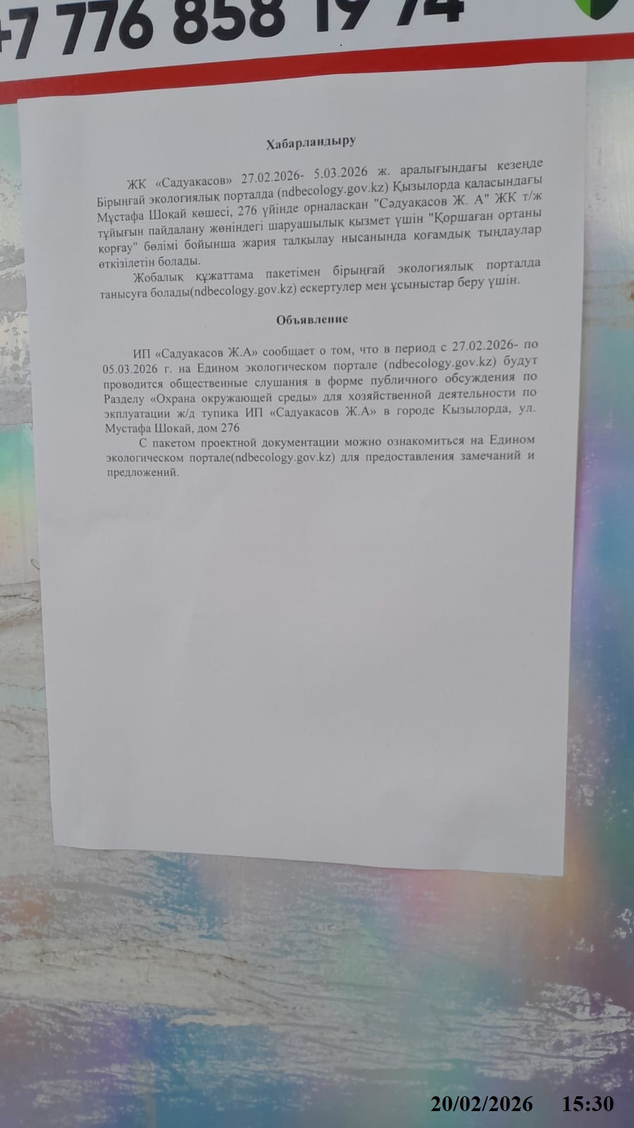 По проекту: Разделу «Охрана окружающей среды» для хозяйственной деятельности по экплуатации ж/д тупика ИП «Садуакасов Ж.А» в городе Кызылорда, ул. Мустафа Шокай, дом 276