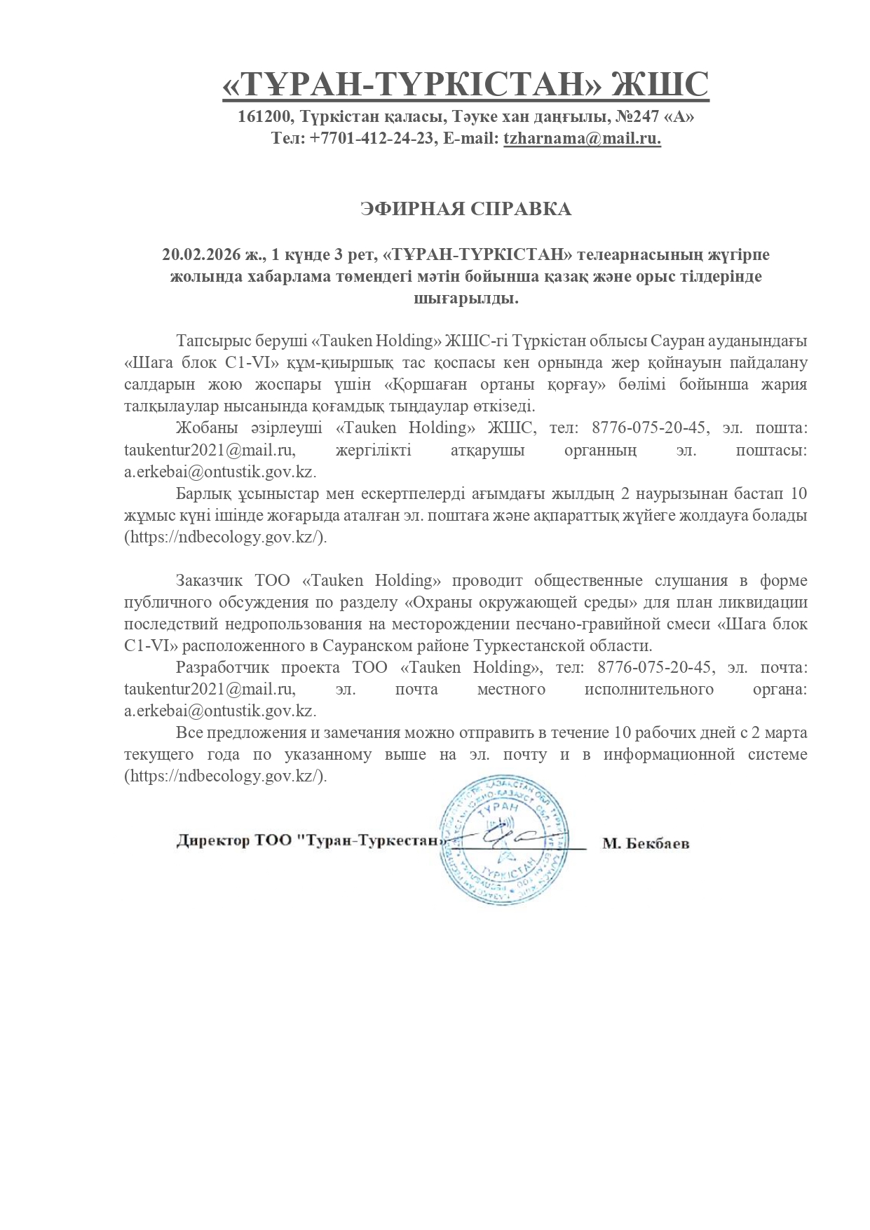 1.3. Контакты:taukentur2021@mail.ru; ;