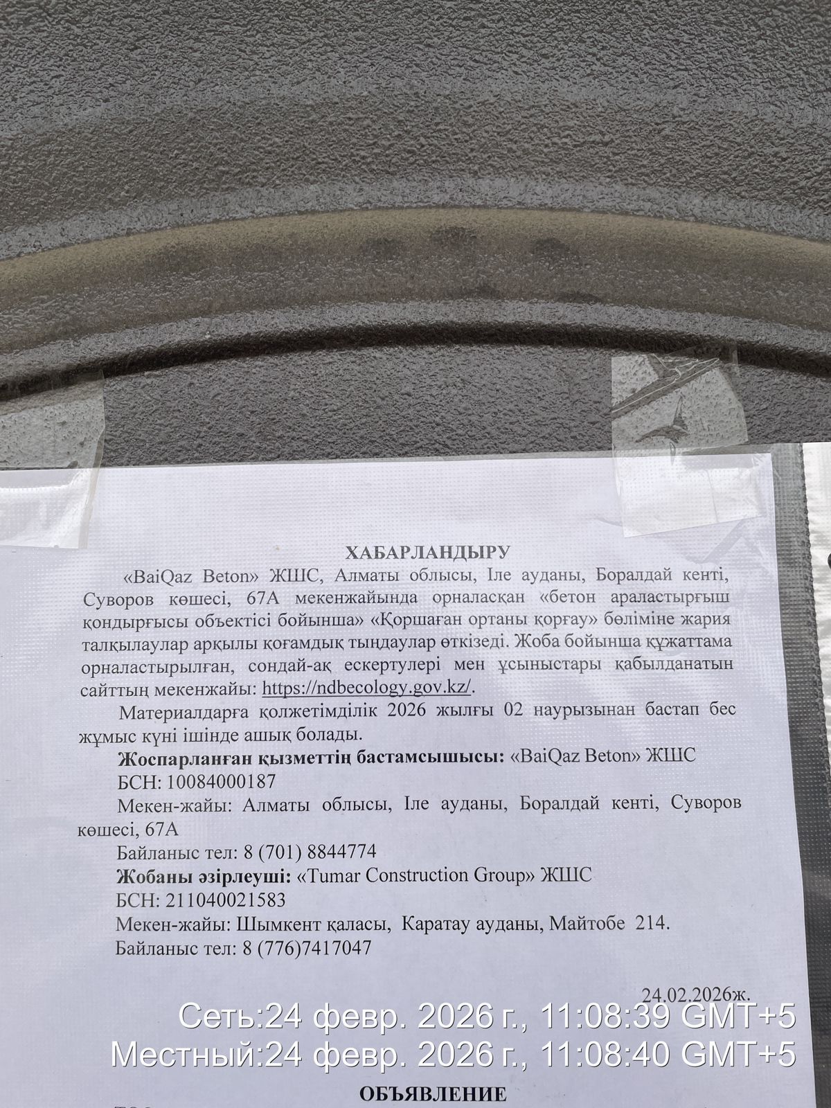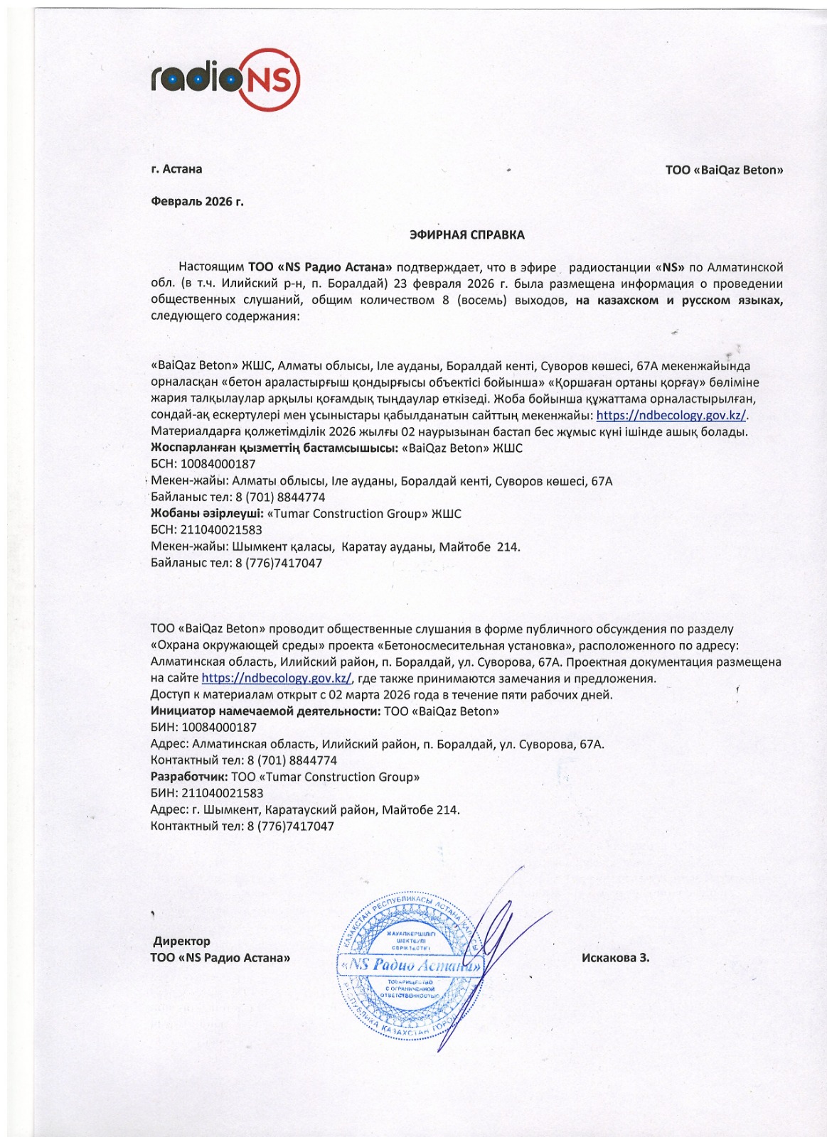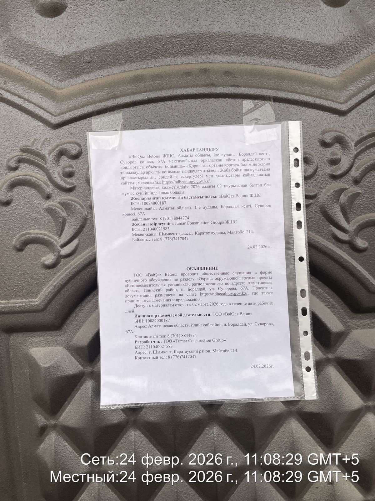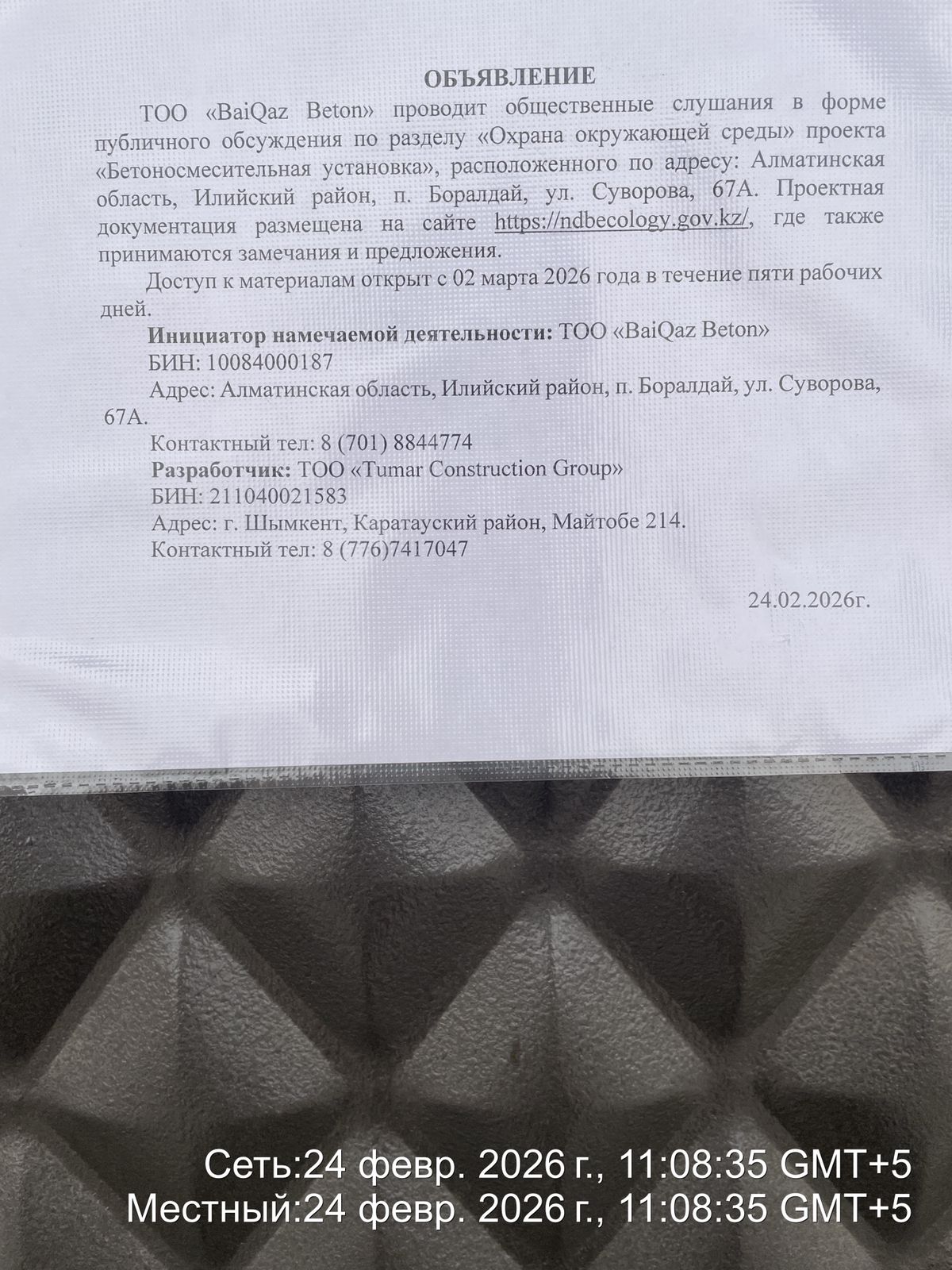 По проекту: Раздел «Охрана окружающей среды» Бетоносмесительная установка, расположенного по адресу: Алматинская область, Илийский район, посёлок Боралдай, улица Суворова, дом 67А.