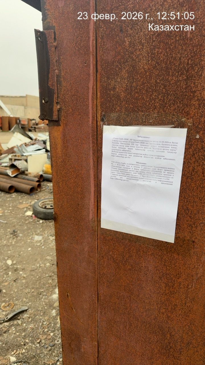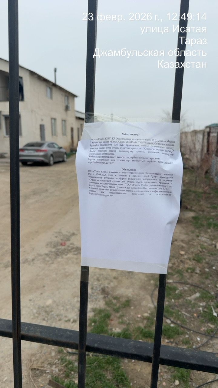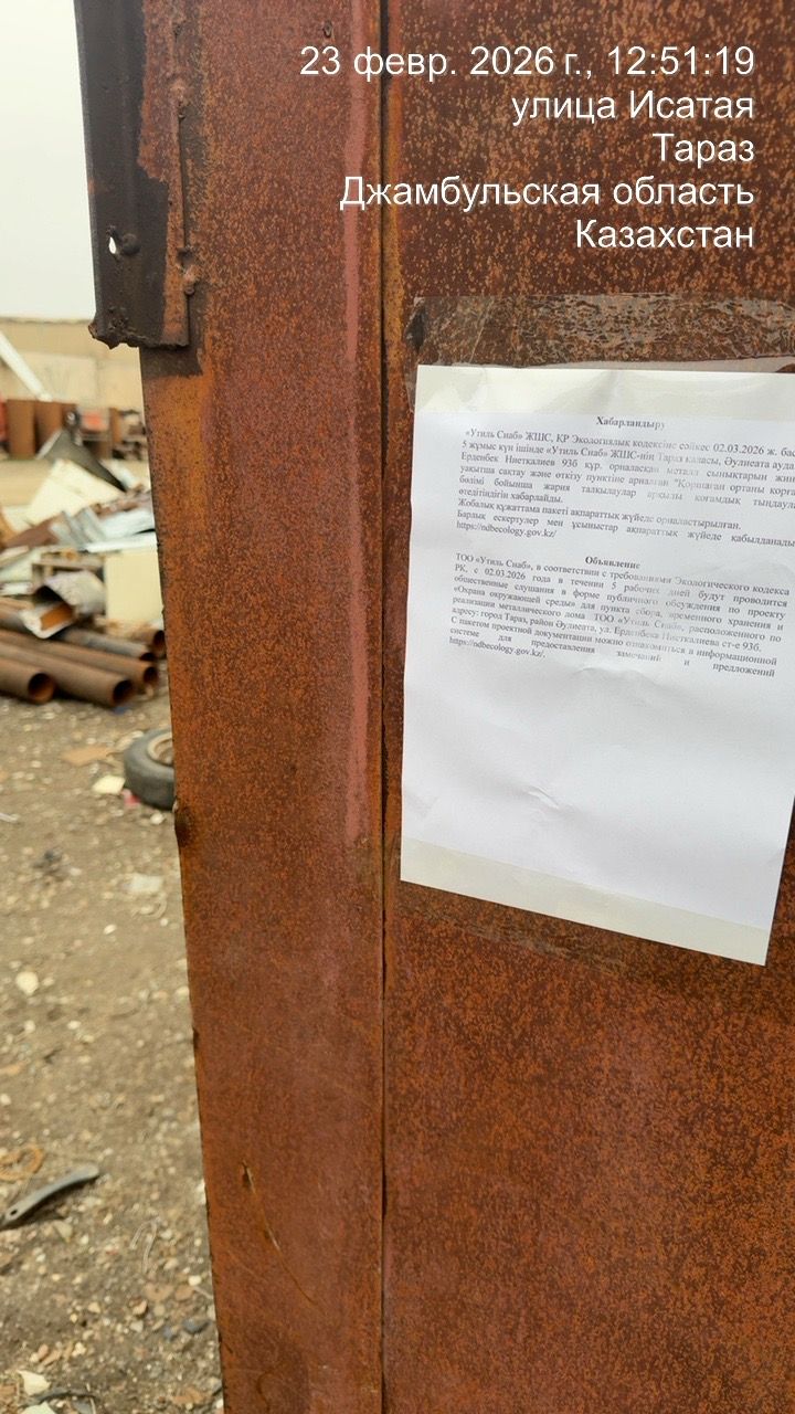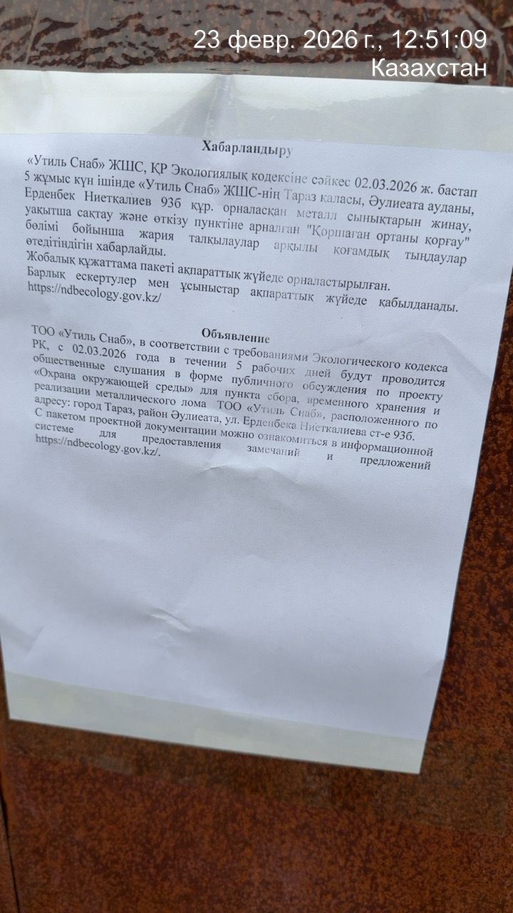 По проекту: «Охрана окружающей среды» для пункта сбора, временного хранения и реализации металлического лома ТОО «Утиль Снаб», расположенного по адресу: город Тараз, район Әулиеата, ул. Ерденбека Ниеткалиева ст-е 93б.