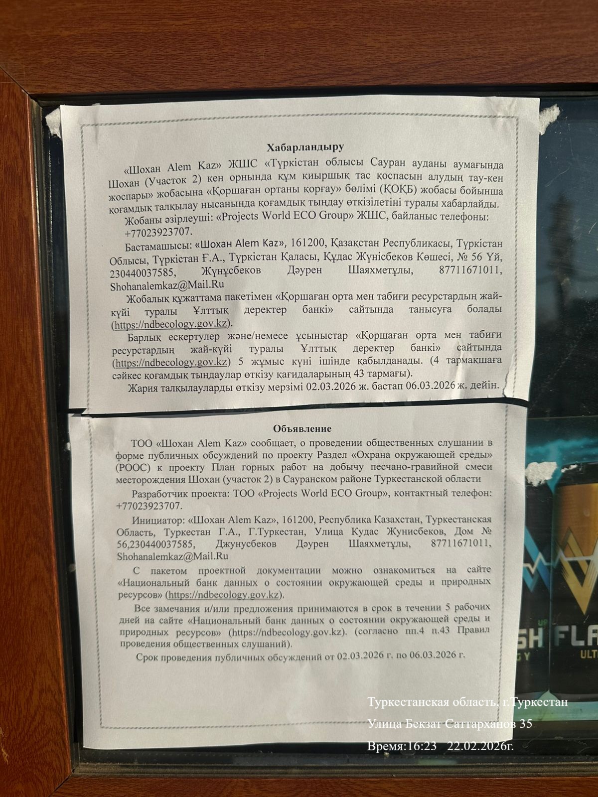 По проекту: Раздел охраны окружающей среды (РООС) к Плану горных работ на добычу песчано-гравийной смеси месторождения Шохан (участок 2) в Сауранском районе Туркестанской области
