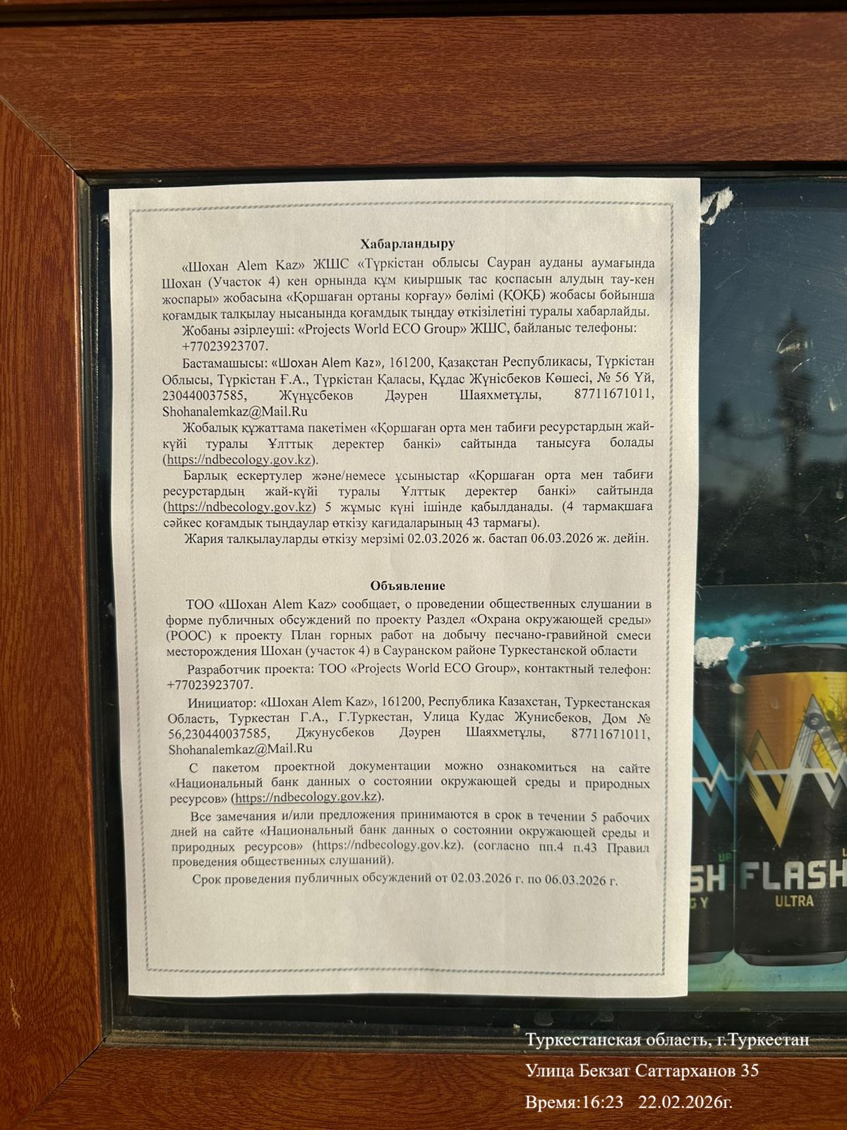 По проекту: Раздел охраны окружающей среды (РООС) к Плану горных работ на добычу песчано-гравийной смеси месторождения Шохан (участок 4) в Сауранском районе Туркестанской области