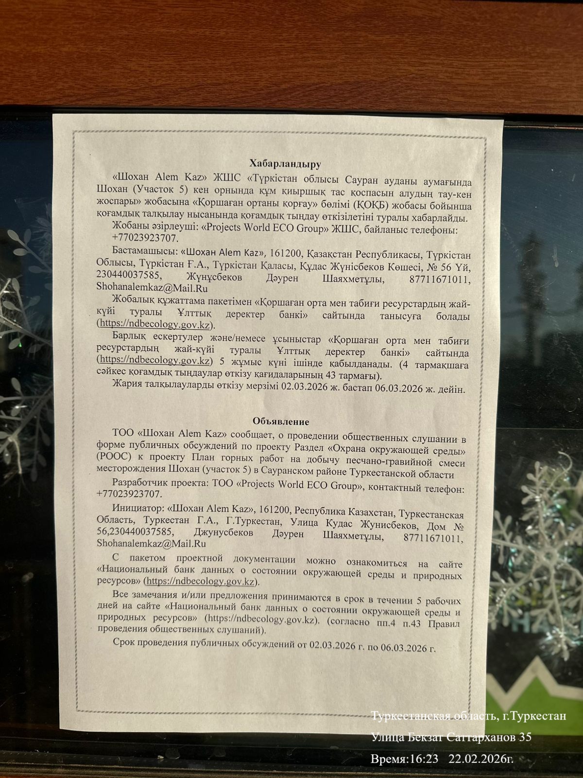 По проекту: Раздел охраны окружающей среды (РООС) к Плану горных работ на добычу песчано-гравийной смеси месторождения Шохан (участок 5) в Сауранском районе Туркестанской области