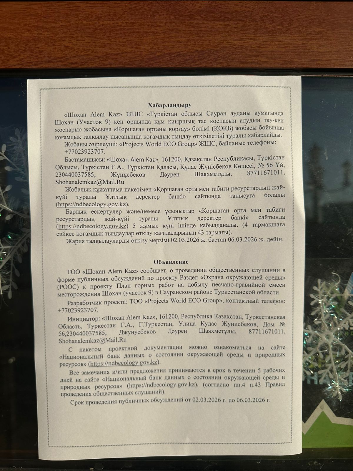 По проекту: Раздел охраны окружающей среды (РООС) к Плану горных работ на добычу песчано-гравийной смеси месторождения Шохан (участок 9) в Сауранском районе Туркестанской области