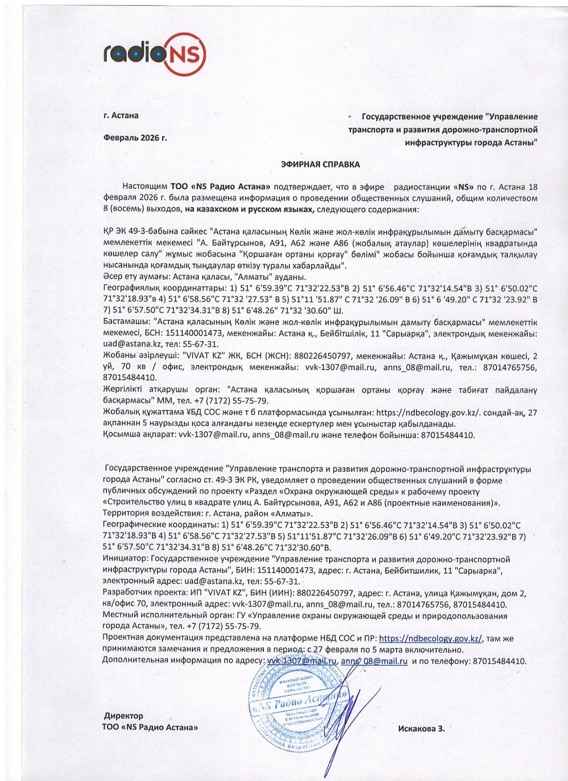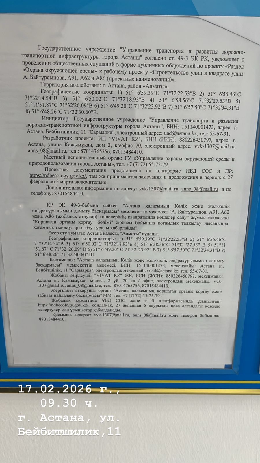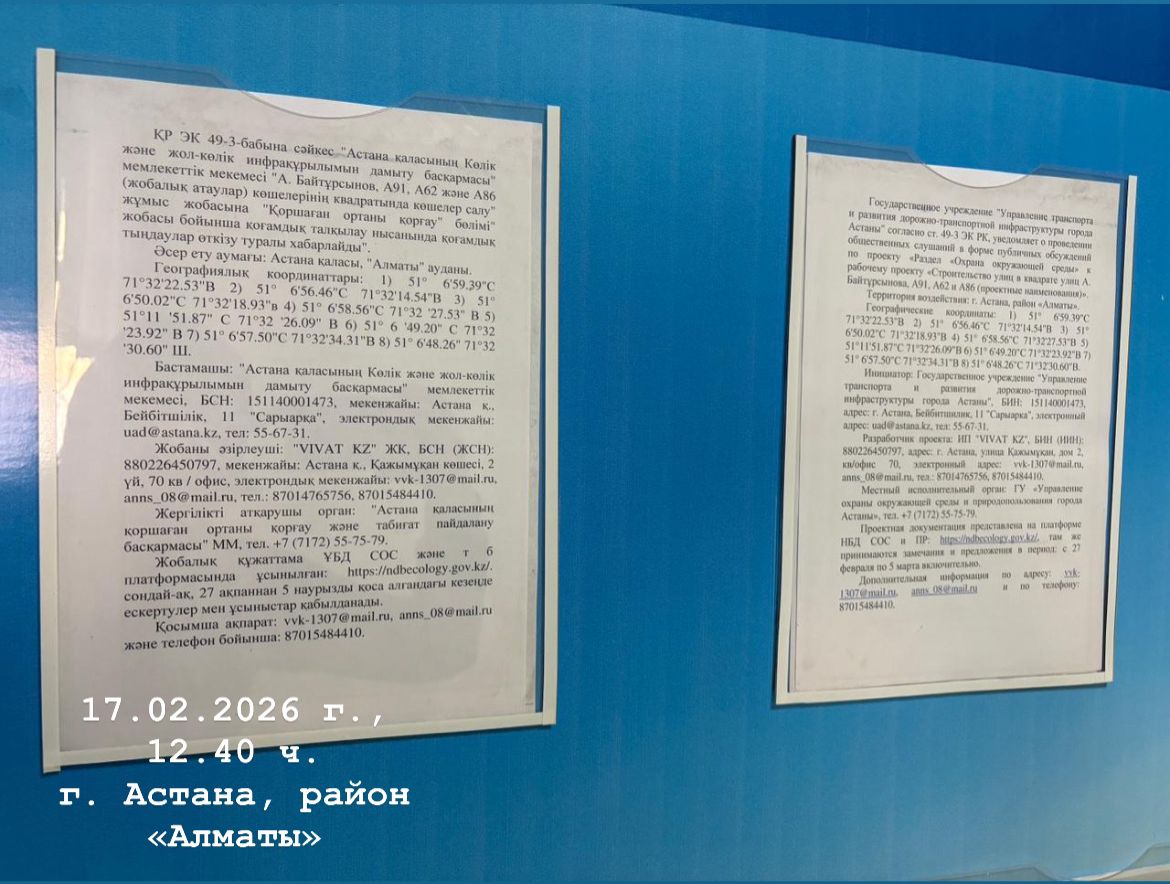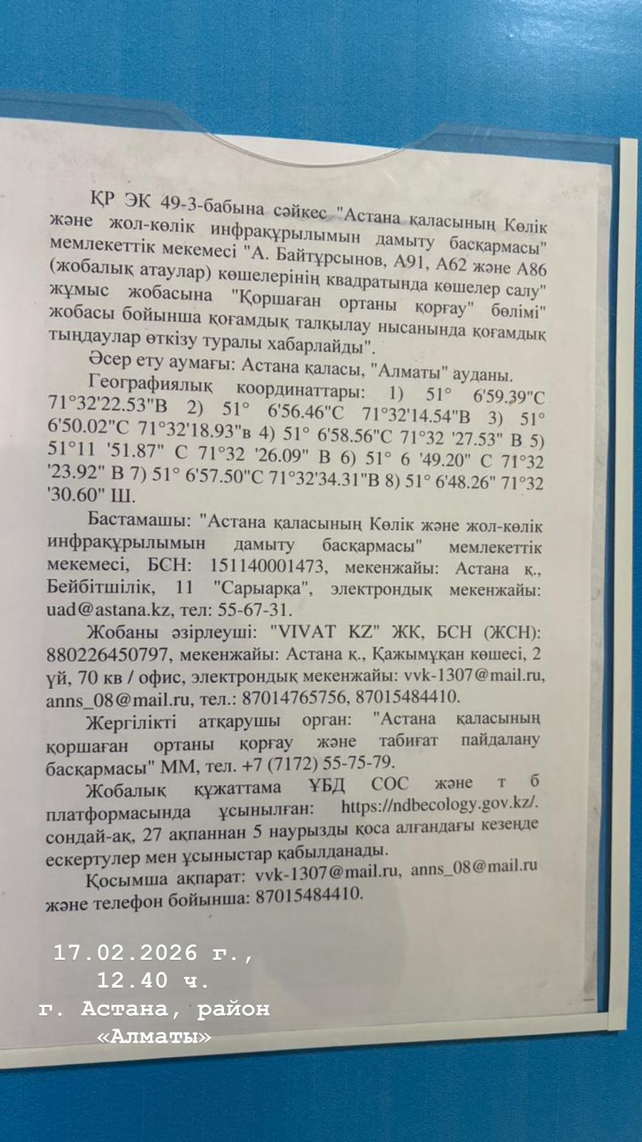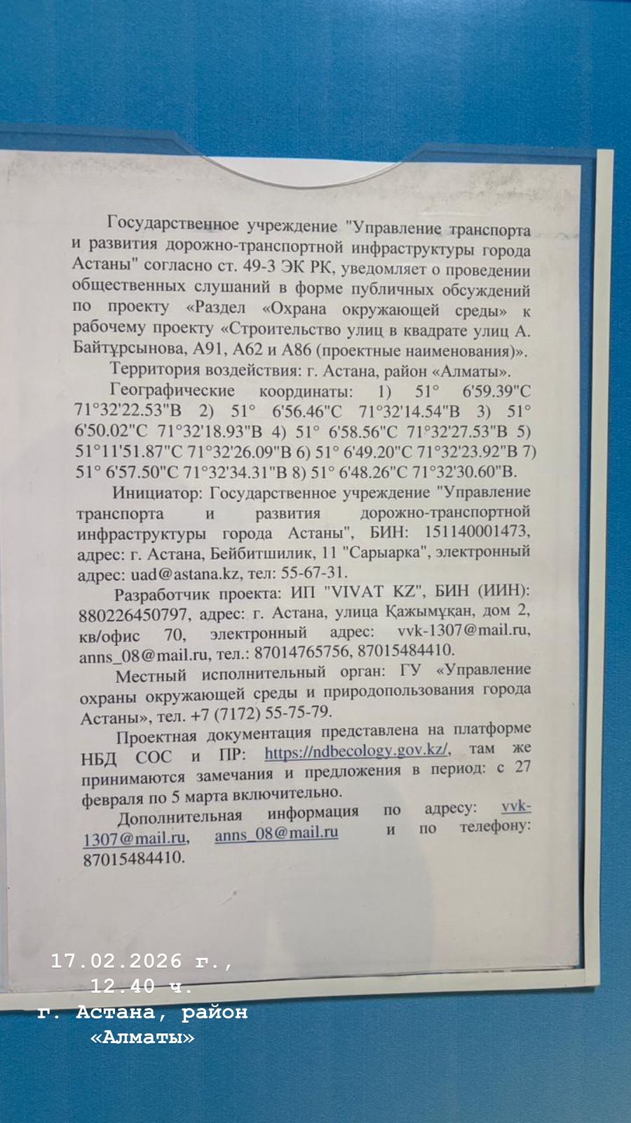 По проекту: "Строительство улиц в квадрате улиц А. Байтұрсынова, А91, А62 и А86 (проектные наименования)"
