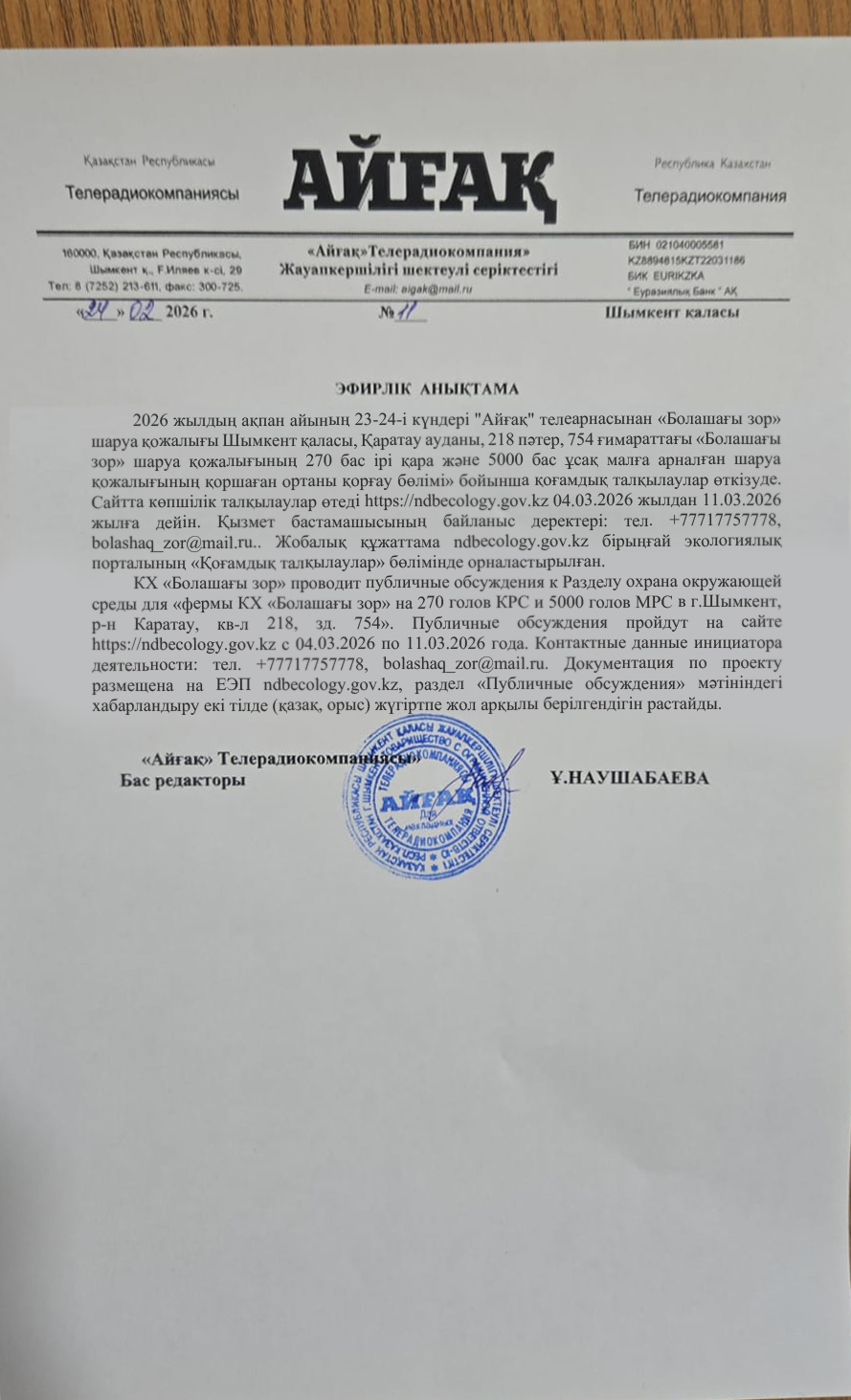 По проекту: Раздел охраны окружающей среды (ООС) для «Откормочной площадки КХ «Болашағы зор» в г.Шымкент, р-н Каратау, кв-л 218, зд. 754»