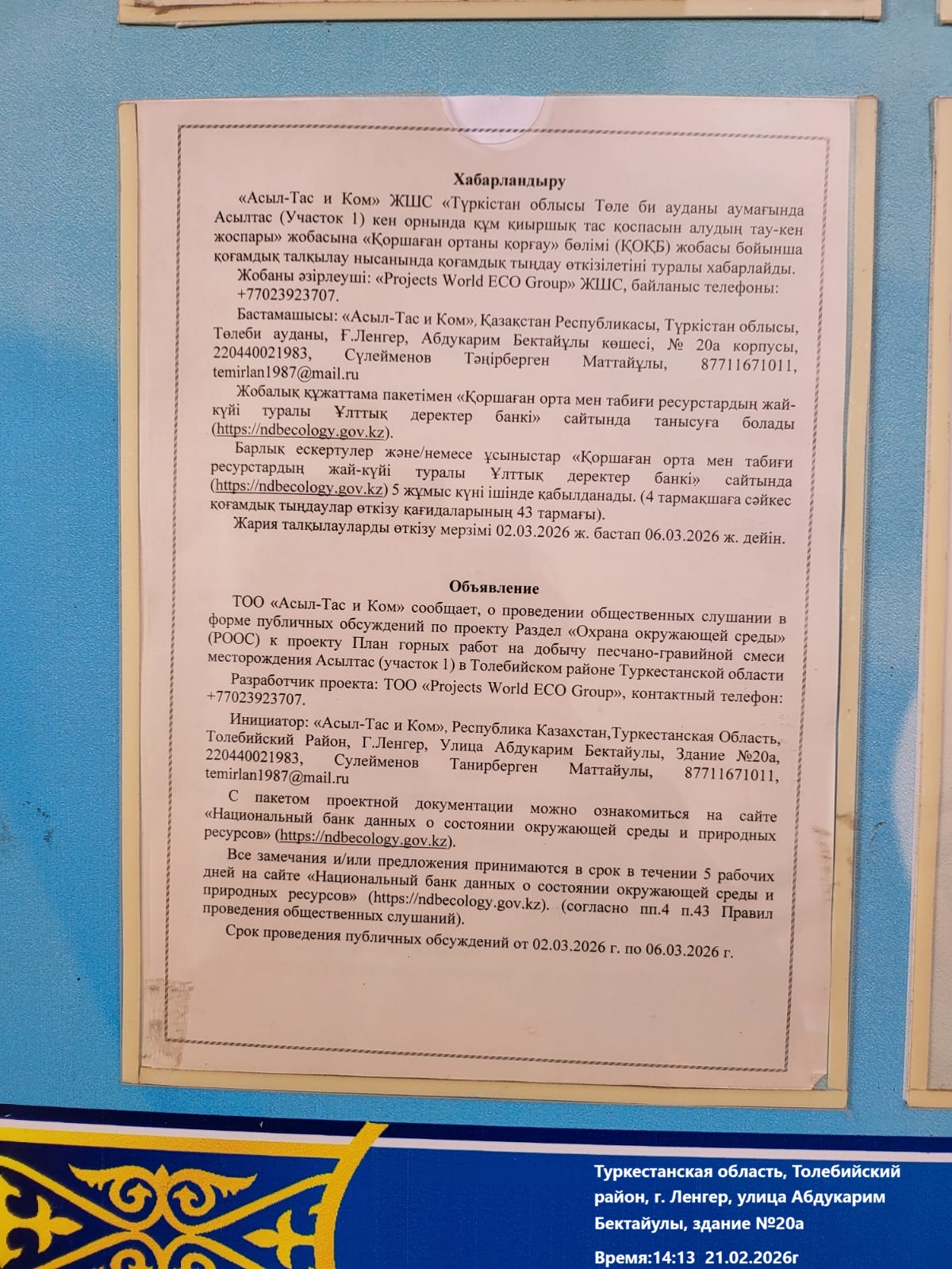 По проекту: Раздел охраны окружающей среды (РООС) к Плану горных работ на добычу песчано-гравийной смеси месторождения Асылтас (участок 1) в Толебийском районе Туркестан-ской области