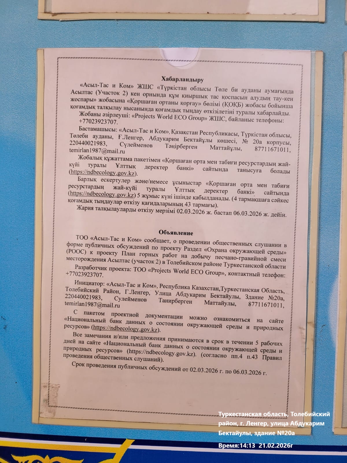 По проекту: Раздел охраны окружающей среды (РООС) к Плану горных работ на добычу песчано-гравийной смеси месторождения Асылтас (участок 2) в Толебийском районе Туркестанской области