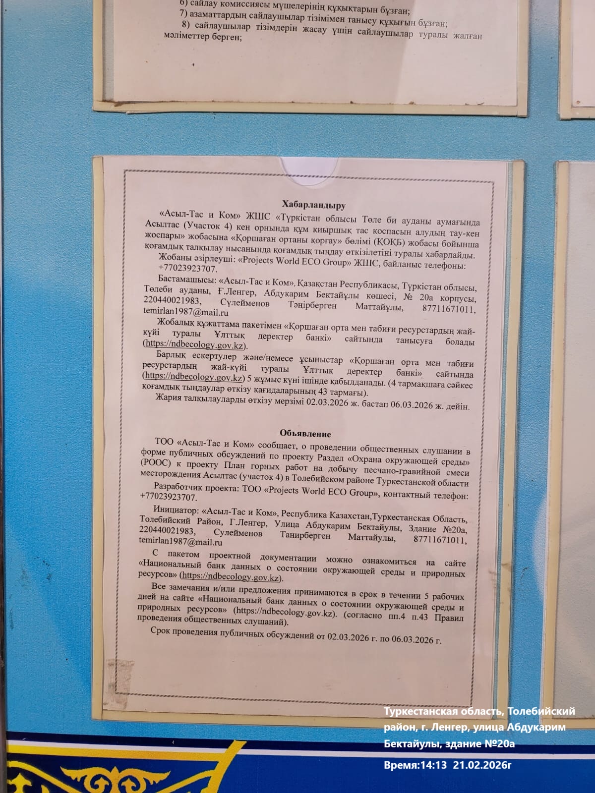 По проекту: Раздел охраны окружающей среды (РООС) к Плану горных работ на добычу песчано-гравийной смеси месторождения Асылтас (участок 4) в Толебийском районе Туркестанской области