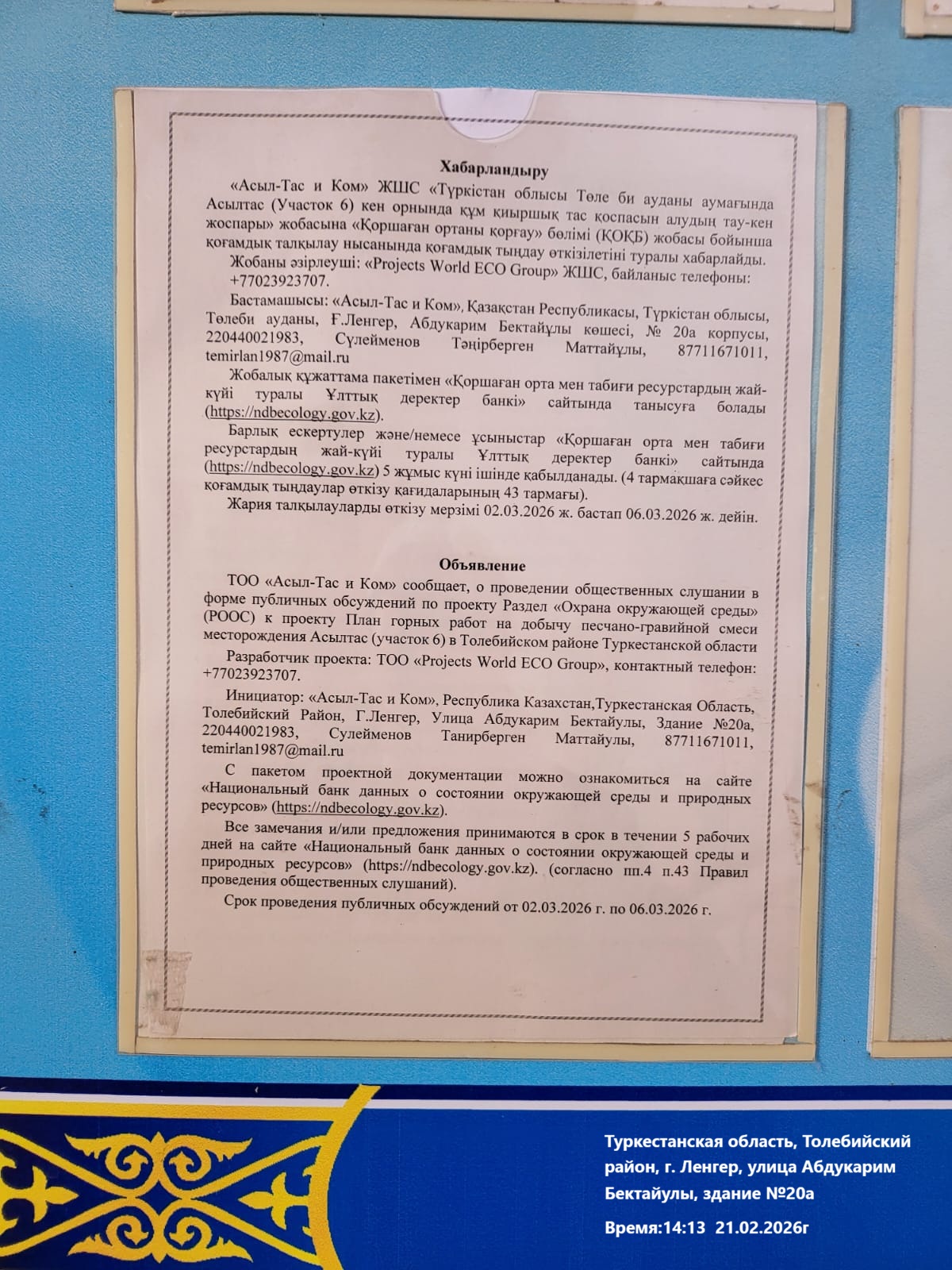 По проекту: Раздел охраны окружающей среды (РООС) к Плану горных работ на добычу песчано-гравийной смеси месторождения Асылтас (участок 6) в Толебийском районе Туркестанской области