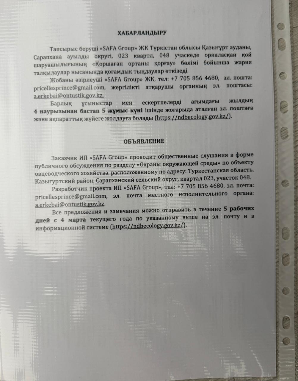 По проекту: РАЗДЕЛ «ОХРАНЫ ОКРУЖАЮЩЕЙ СРЕДЫ» для разведение овцеводческого хозяйства ИП «SAFA Group» расположенного по адресу: Туркестанская область, Казыгуртский район, с.о. Сарапхана, 023 кварт., уч. 048