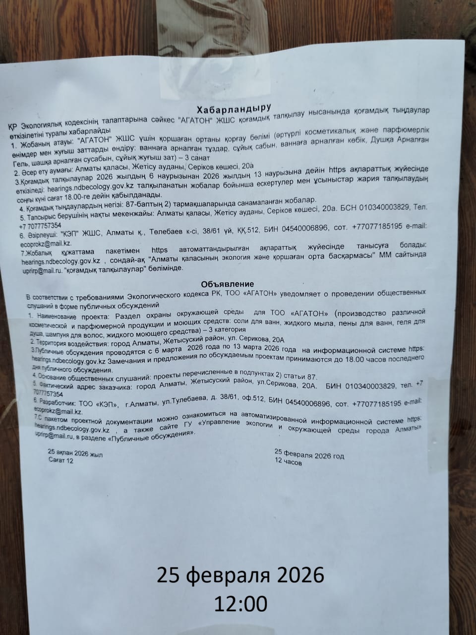 По проекту: РАЗДЕЛ «ОХРАНА ОКРУЖАЮЩЕЙ СРЕДЫ» ДЛЯ ТОВАРИЩЕСТВА С ОГРАНИЧЕСКОЙ ОТВЕТСТВЕННОСТЬЮ «АГАТОН» (производство различной косметической и парфюмерной продукции и моющих средств: соли для ванн, жидкого мыла, пены для ванн, геля для душа, шампуня для волос, жидкого моющего средства ) – 3 категория На 2026-2035 гг