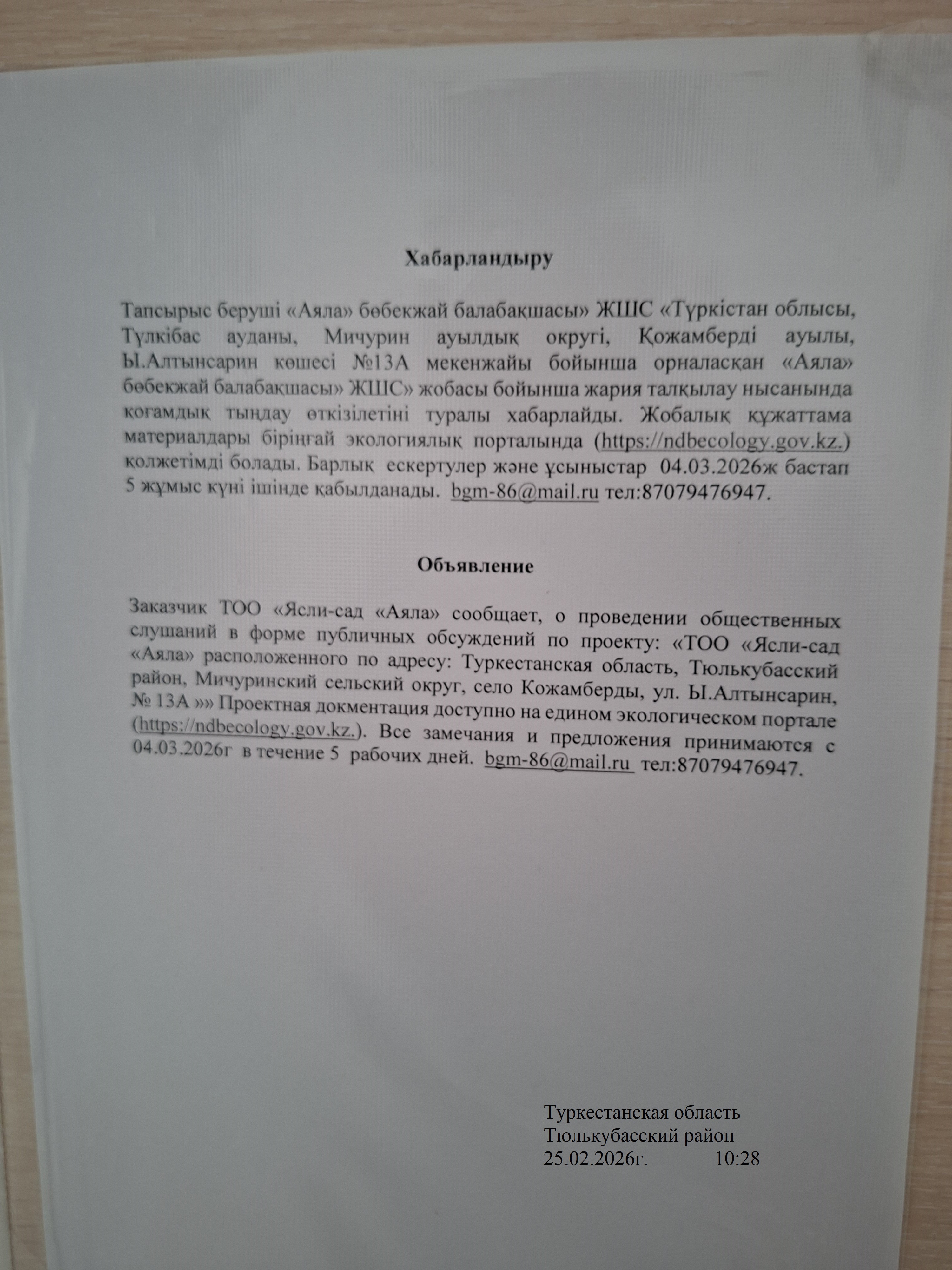 По проекту: ТОО «Ясли-сад Аяла» расположенного по адресу: Туркестанская область, Тюлькубасский район, Мичуринский сельский округ, село Кожамберды, ул. Ы.Алтынсарин, № 13А