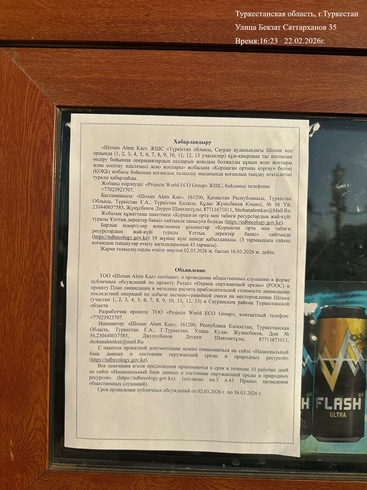По проекту: Раздел «Охрана окружающей среды» (РООС) к «Плану ликвидации и методика расчета приблизительной стоимости ликвидации последствий операций по добыче песчано-гравийной смеси на месторождении Шохан (участки 1, 2, 3, 4, 5, 6, 7, 8, 9, 10, 11, 12, 13) в Сауранском районе Туркестанской области