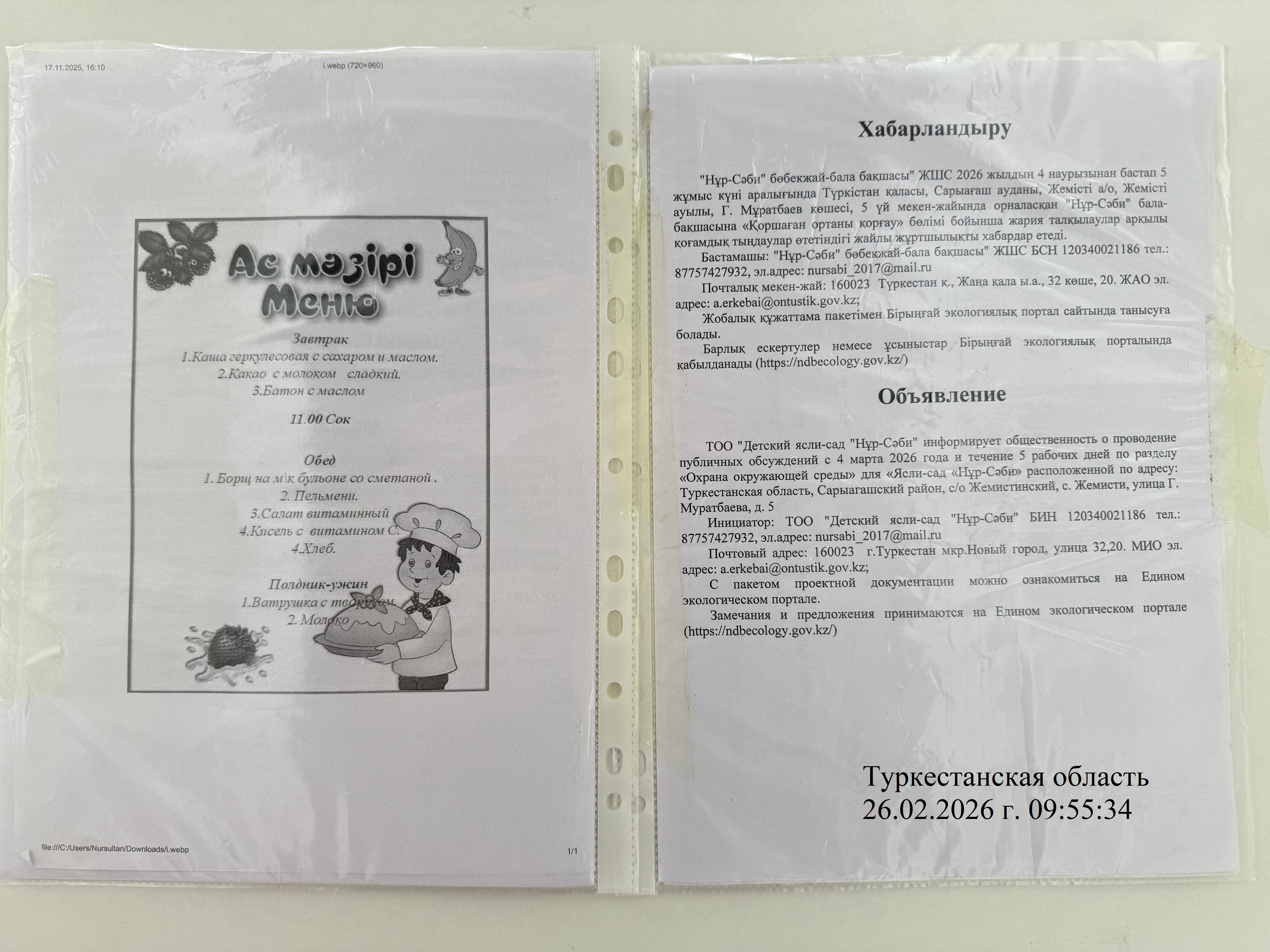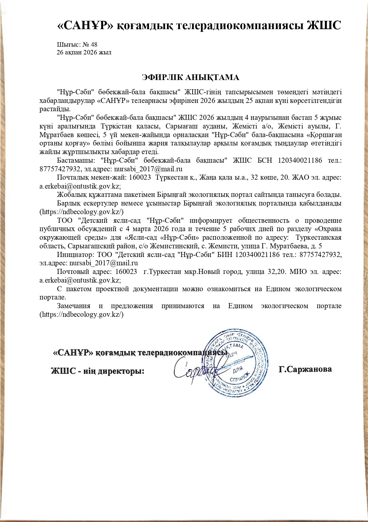 По проекту: РАЗДЕЛ «Охрана окружающей среды» для Товарищество с ограниченной ответственностью "Детский ясли-сад "Нұр- Сәби" расположенной по адресу: Туркестанская область, Cарыагашский район, с/о Жемистинский, с. Жемисти, улица Г. Муратбаева, д. 5