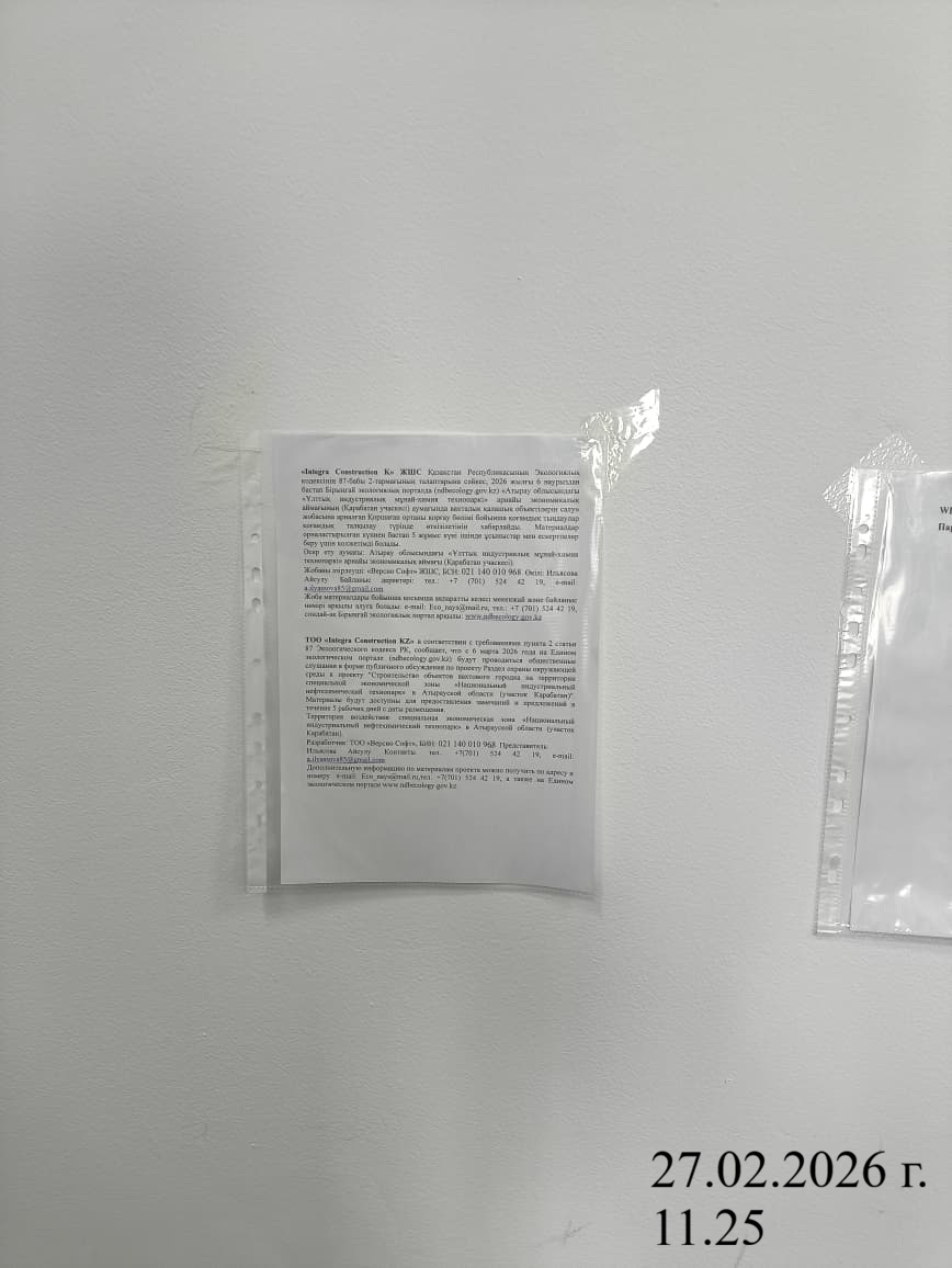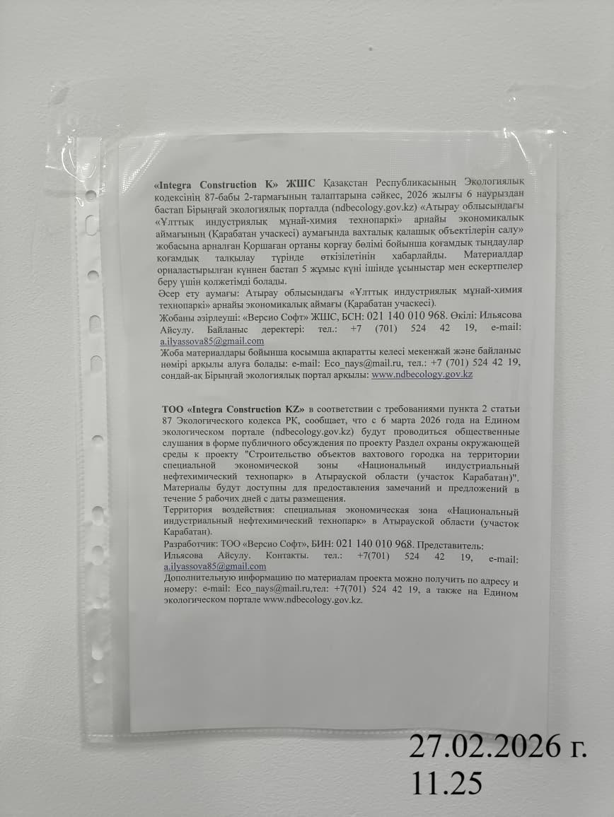 По проекту: «Строительство объектов вахтового городка на территории специальной экономической зоны «Национальный индустриальный нефтехимический технопарк» в Атырауской области (участок Карабатан)»
