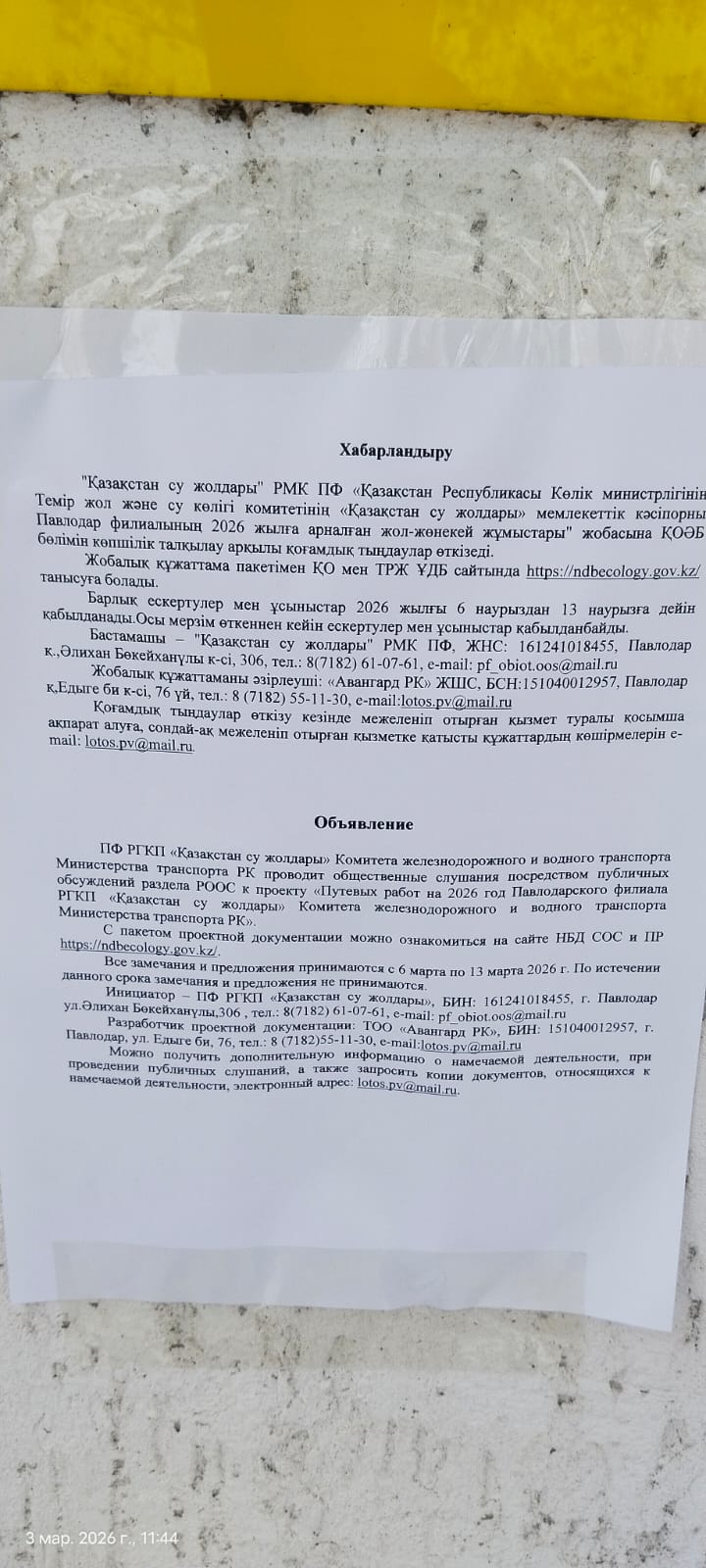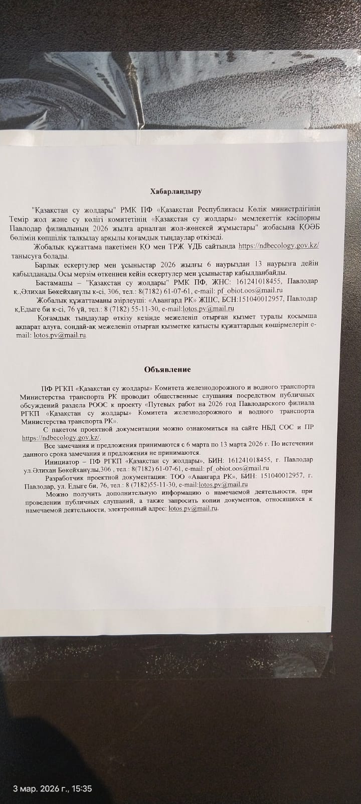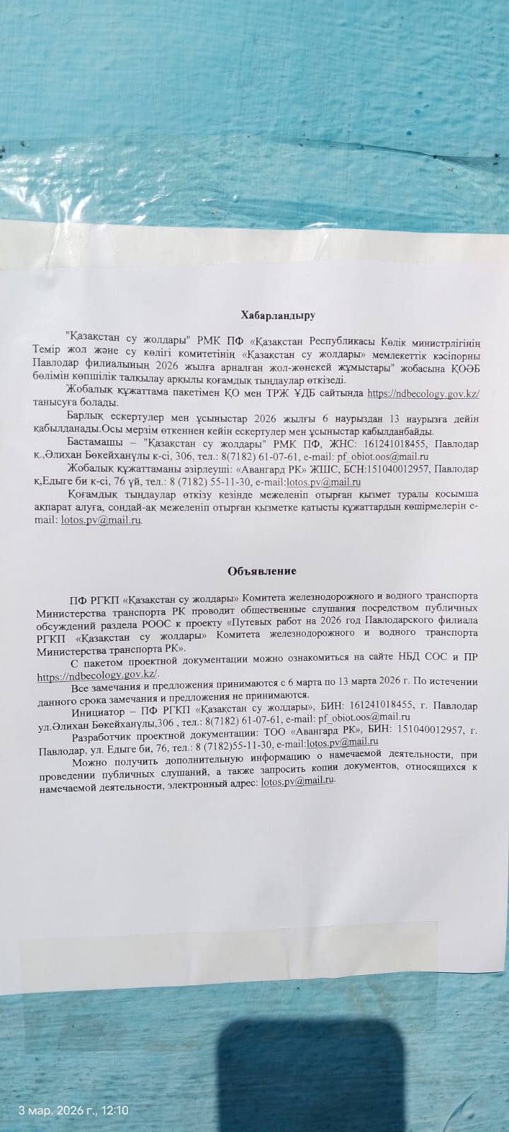 По проекту: проект «Путевых работ на 2026 год Павлодарского филиала РГКП «Қазақстан су жолдары» Комитета железнодорожного и водного транспорта Министерства транспорта РК»