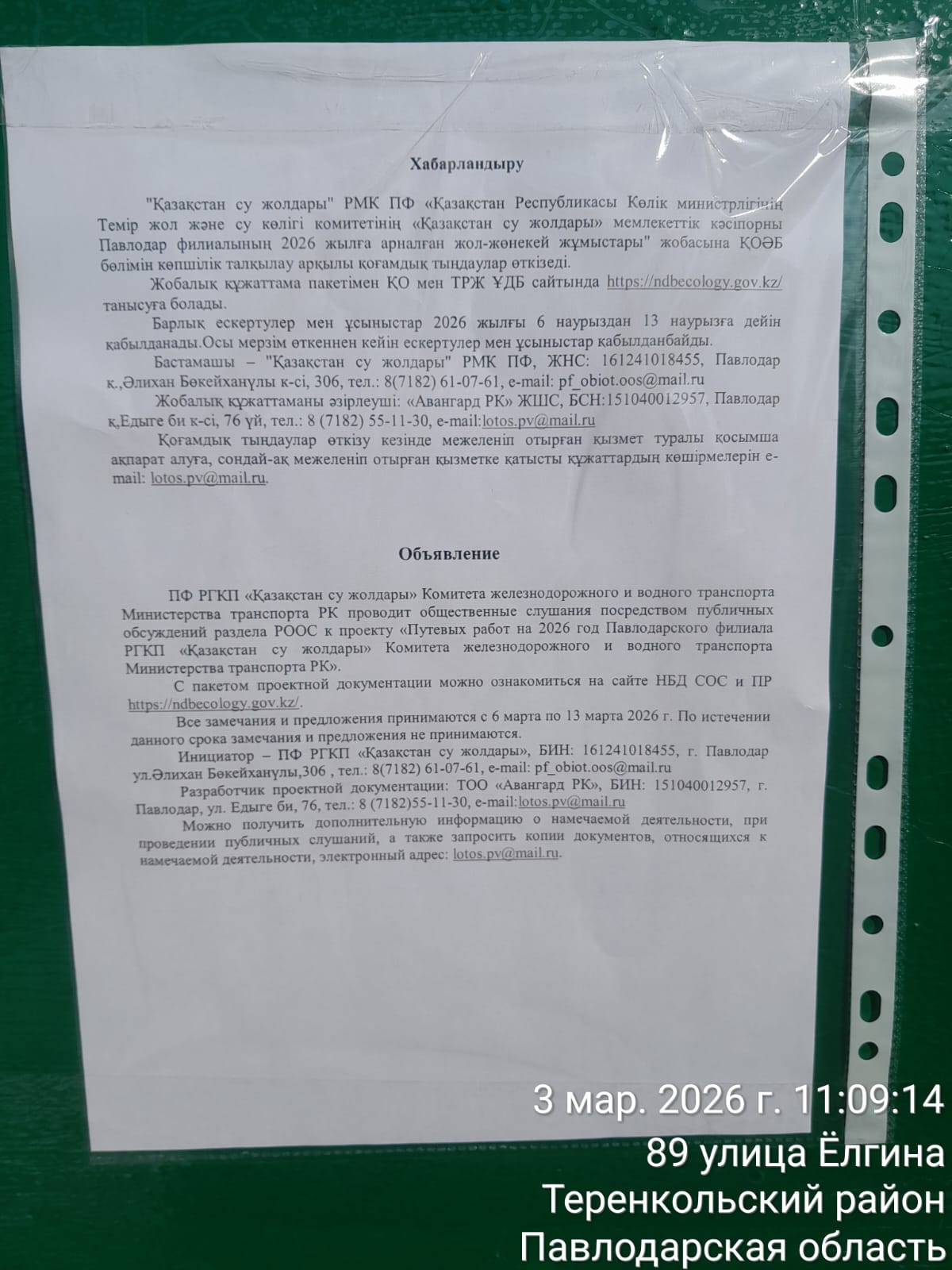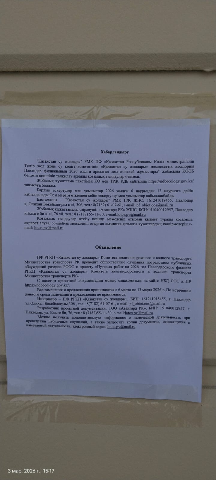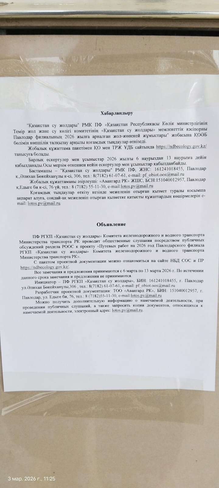 По проекту: проект «Путевых работ на 2026 год Павлодарского филиала РГКП «Қазақстан су жолдары» Комитета железнодорожного и водного транспорта Министерства транспорта РК»