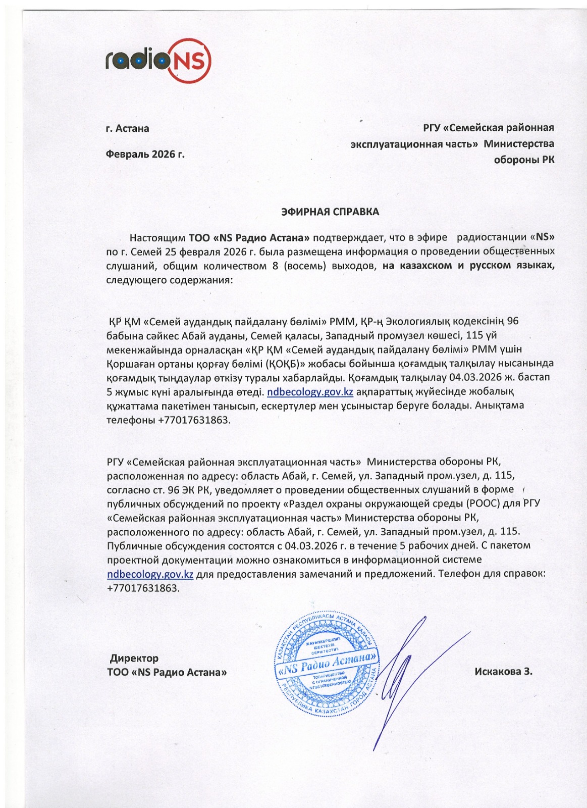 По проекту: Раздел «Охрана окружающей среды» для РГУ «Семейская районная эксплуатационная часть» Министерства обороны РК, расположенного по адресу: область Абай, г. Семей, ул. Западный пром.узел, д. 115