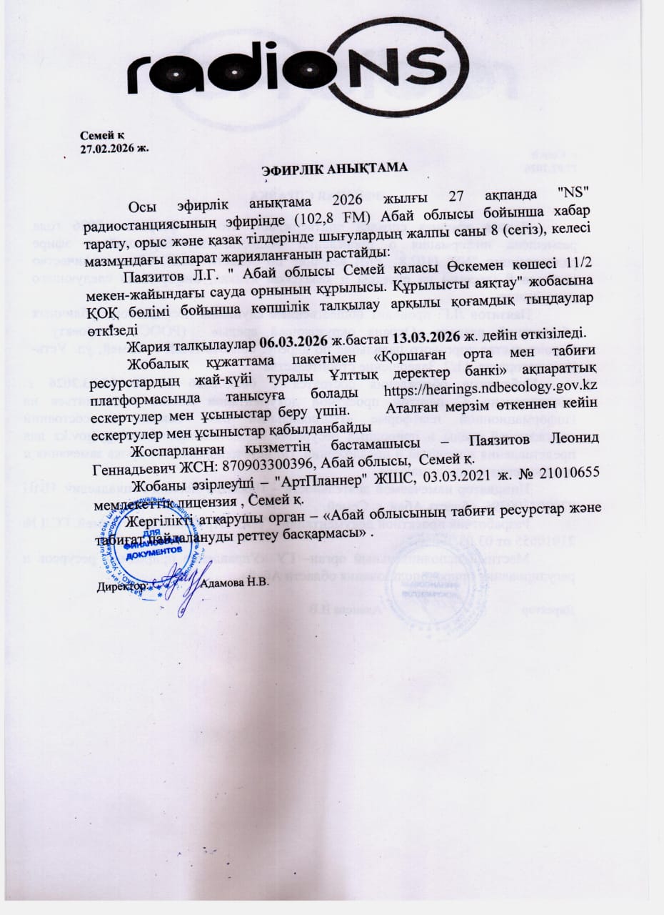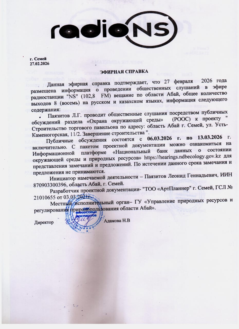 По проекту: Строительство торгового павильона по адресу: область Абай г. Семей, ул. Усть-Каменогорская, 11/2. Завершение строительства