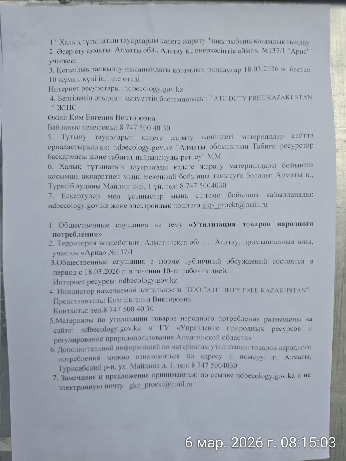 1.3. Контакты:sahinmurat.onal@atudutyfree.com; ndbecology.gov.kz;