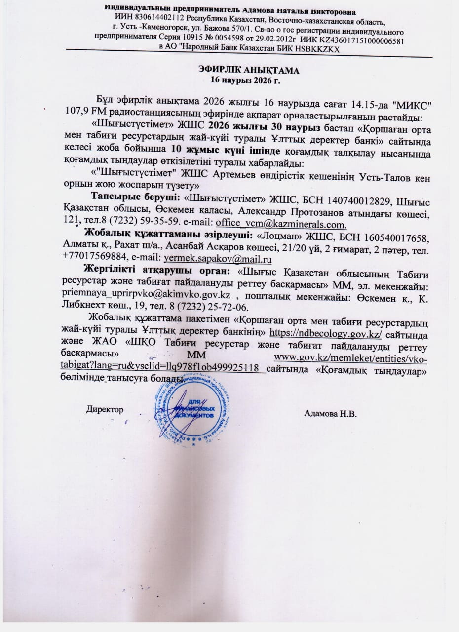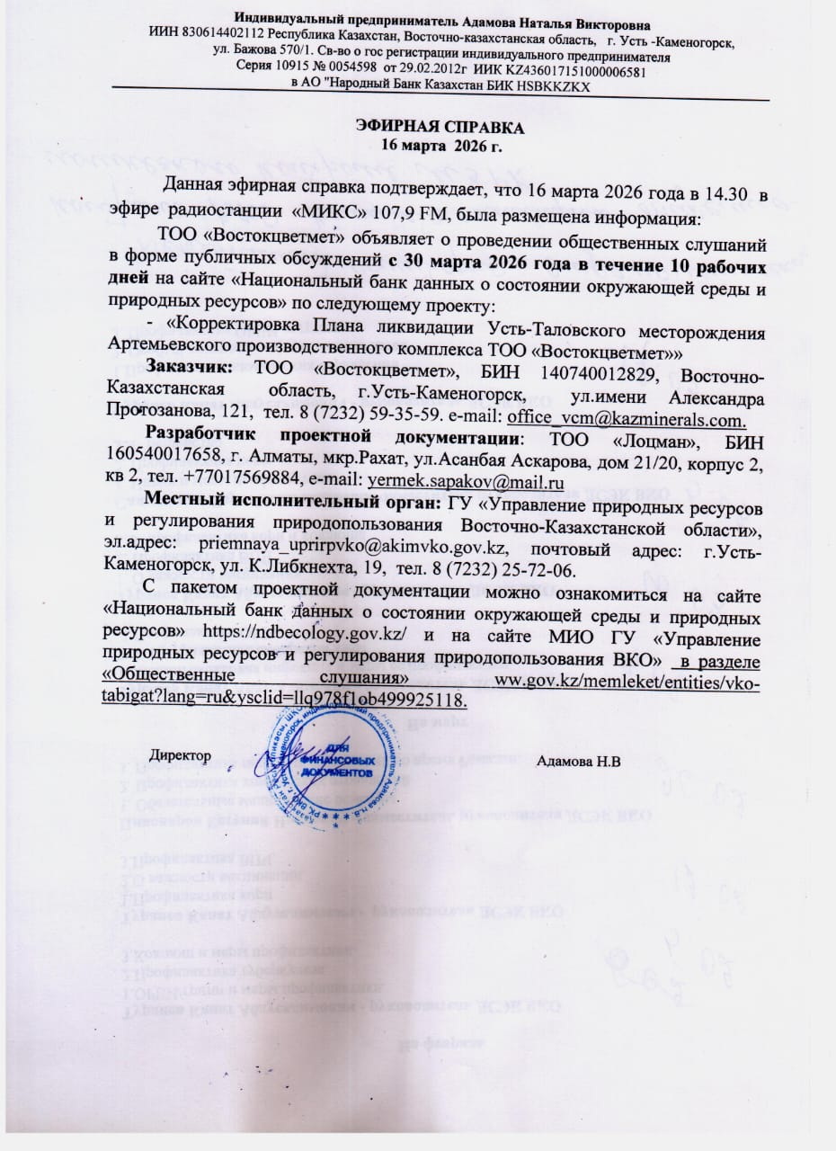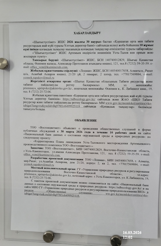 По проекту: Корректировка Плана ликвидации Усть-Таловского месторождения Артемьевского производственного комплекса ТОО «Востокцветмет»