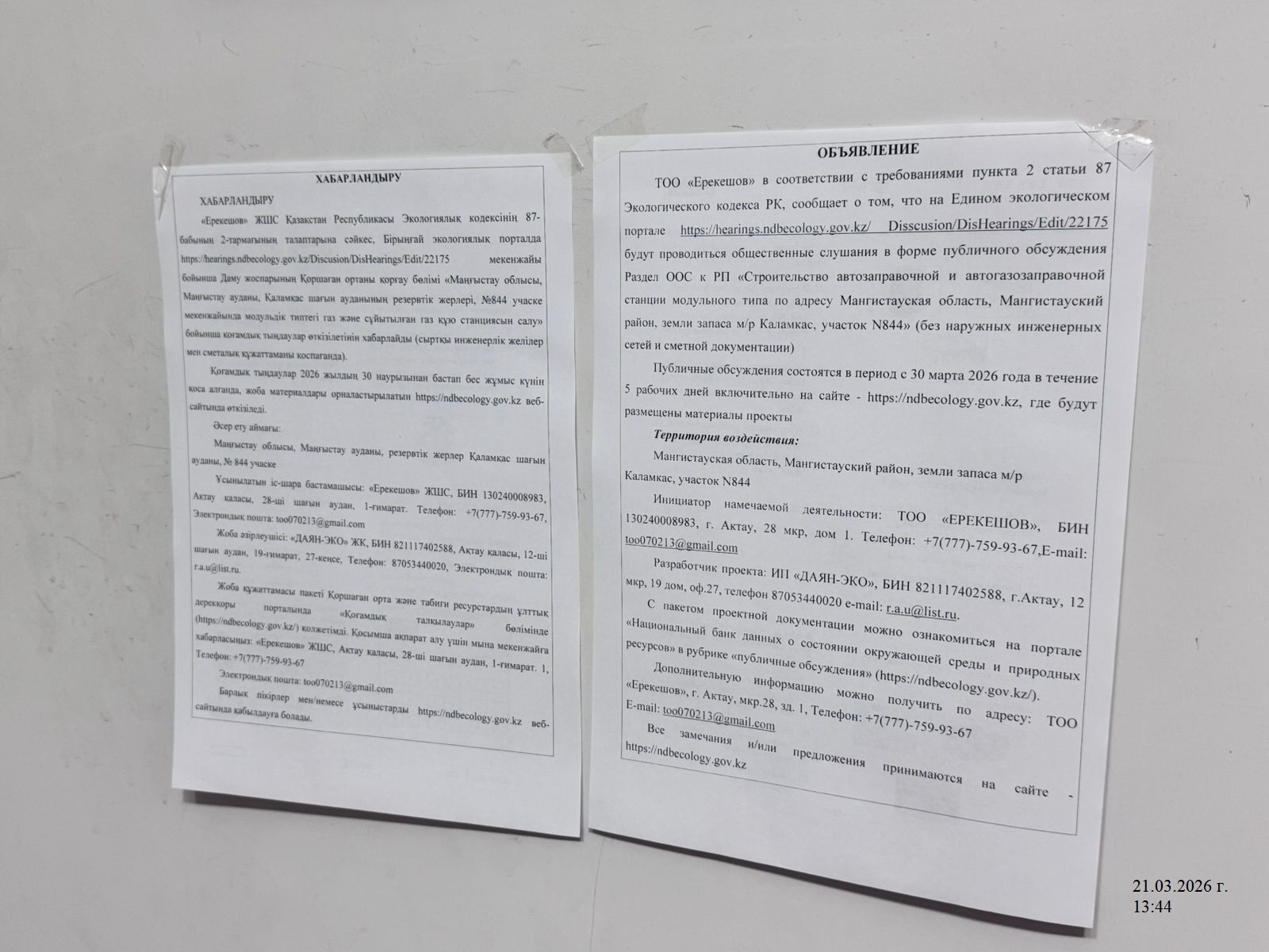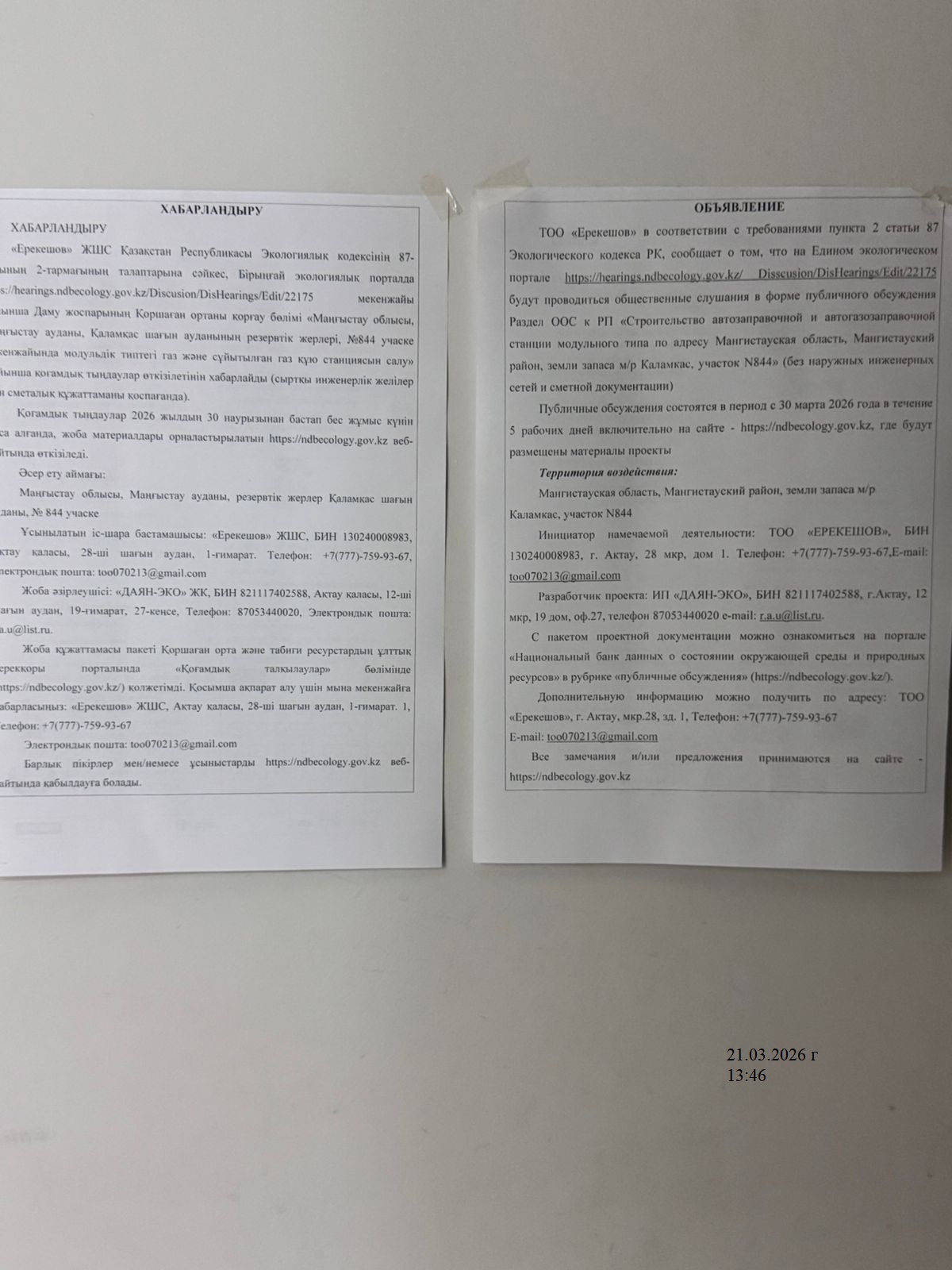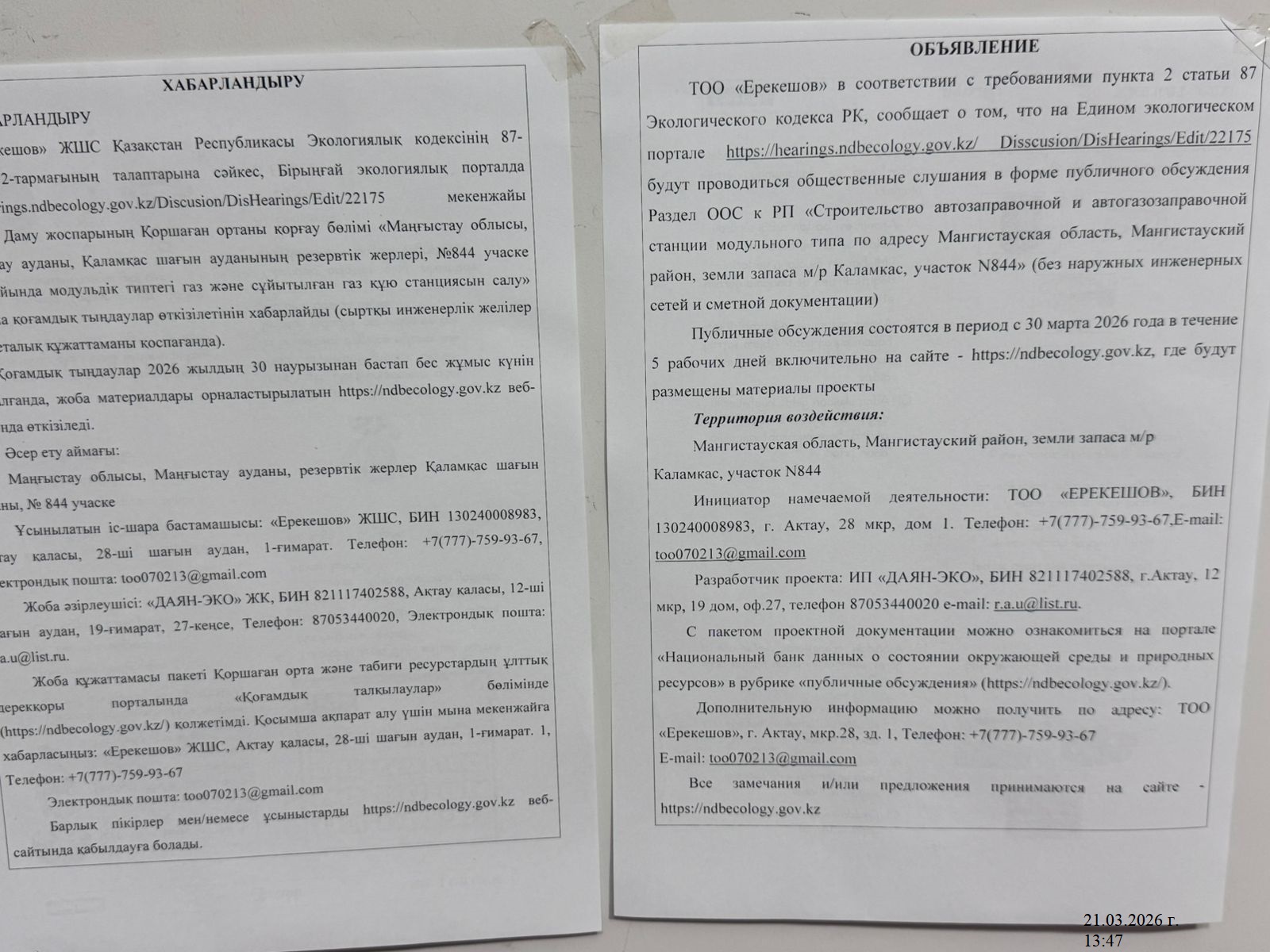 По проекту: РАЗДЕЛ ОХРАНЫ ОКРУЖАЮЩЕЙ СРЕДЫ К РАБОЧЕМУ ПРОЕКТУ «Строительство автозаправочной и автогазозаправочной станции модульного типа по адресу Мангистауская область, Мангистауский район, земли запаса м/р Каламкас, участок N844» (без наружных инженерных сетей и сметной документации)