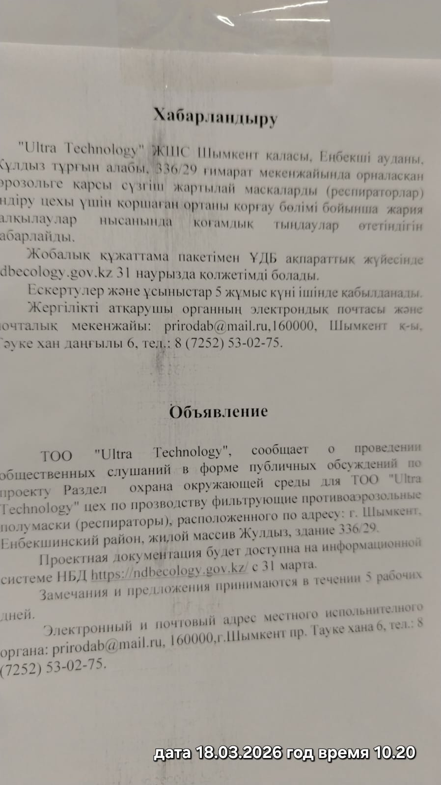 По проекту: Раздел охрана окружающей среды для ТОО "Ultra Technology" цех по прозводству фильтрующие противоаэрозольные полумаски (респираторы), расположенного по адресу: г. Шымкент, Енбекшинский район, жилой массив Жулдыз, здание 336/29