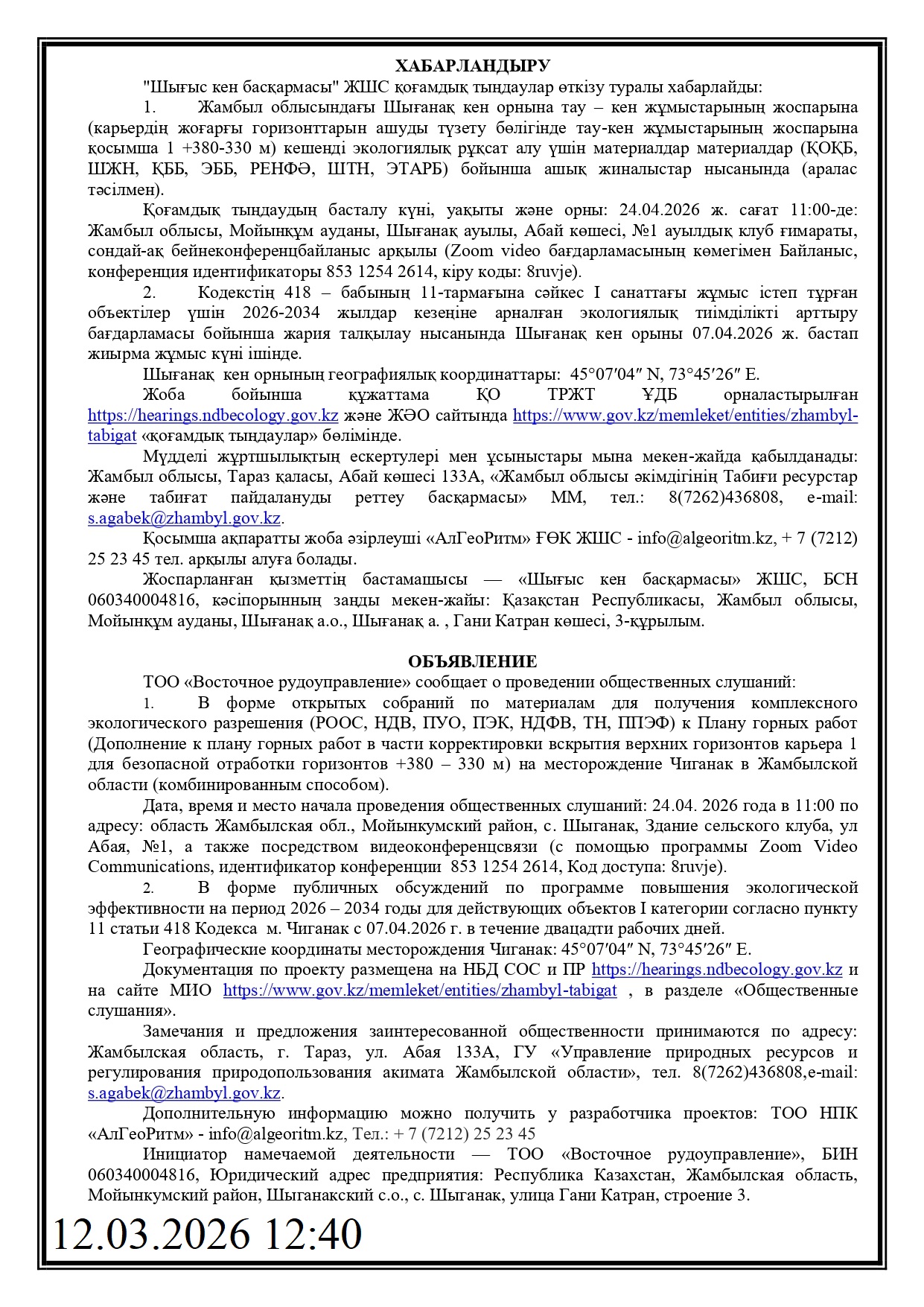 По проекту: Программа повышения экологической эффективности на период 2026 – 2034 годы для действующих объектов I категории согласно пункту 11 статьи 418 Кодекса м. Чиганак