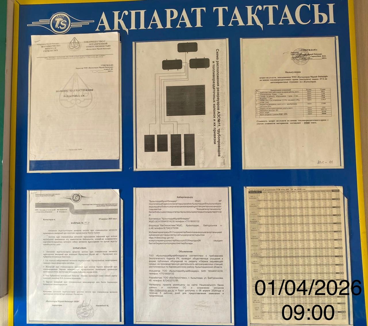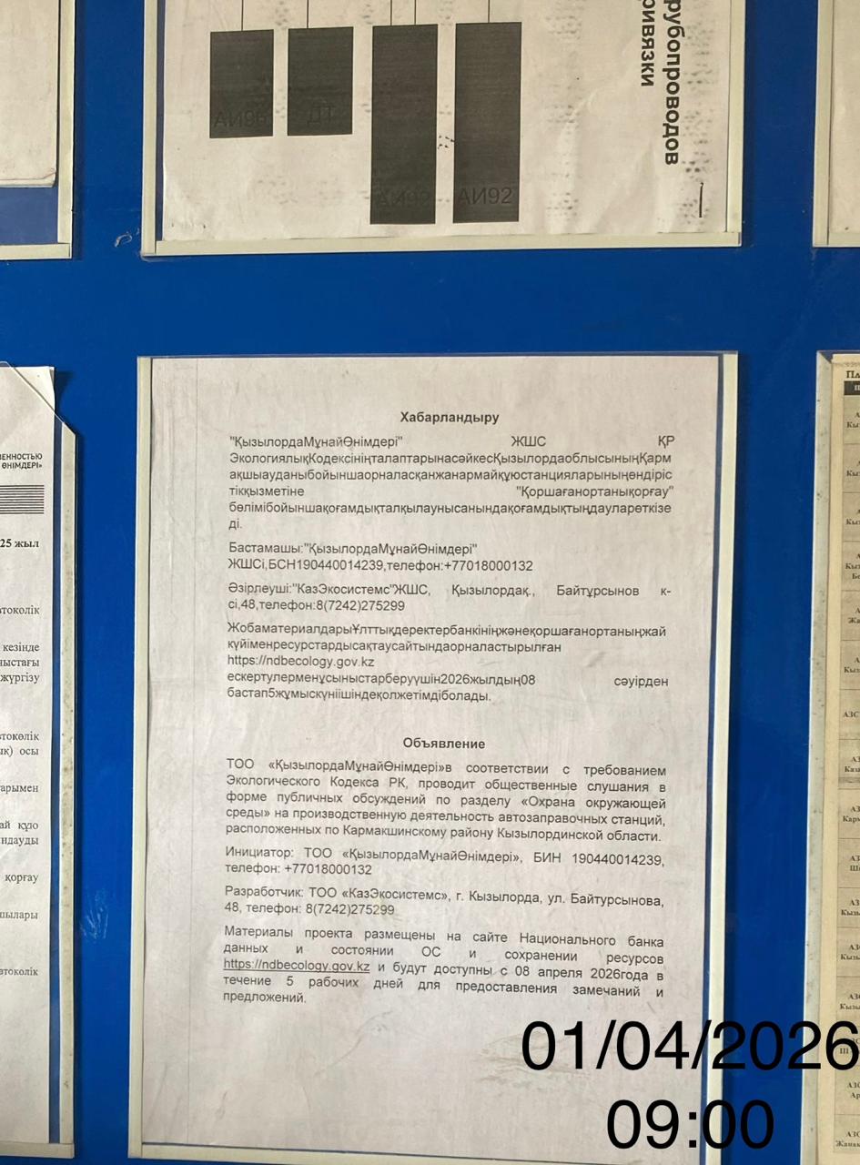 По проекту: РАЗДЕЛ «ОХРАНА ОКРУЖАЮЩЕЙ СРЕДЫ» НА ПРОИЗВОДСТВЕННУЮ ДЕЯТЕЛЬНОСТЬ АВТОЗАПРАВОЧНЫХ СТАНЦИЙ ТОО «ҚЫЗЫЛОРДАМҰНАЙӨНІМДЕРІ», РАСПОЛОЖЕННЫХ НА ТЕРРИТОРИИ КАРМАКШИНСКОГО РАЙОНА КЫЗЫЛОРДИНСКОЙ ОБЛАСТИ