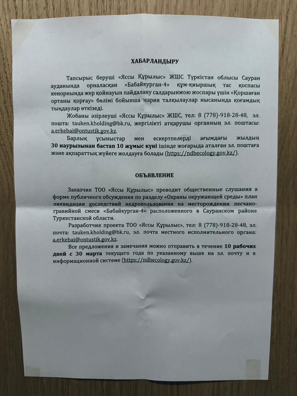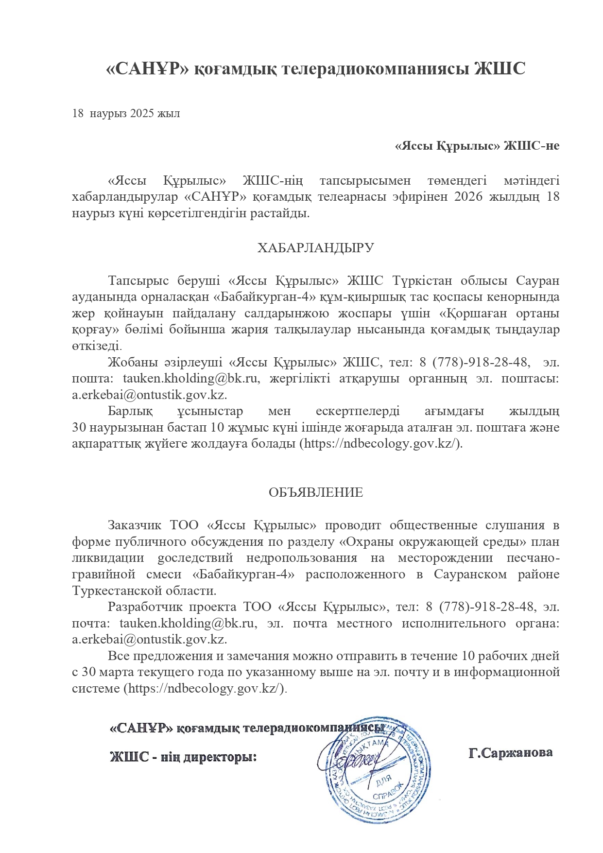 По проекту: РАЗДЕЛ «ОХРАНЫ ОКРУЖАЮЩЕЙ СРЕДЫ» для план ликвидации последствий недропользования на месторождении песчано-гравийной смеси «Бабайкурган-4» расположенного в Сауранском районе Туркестанской области
