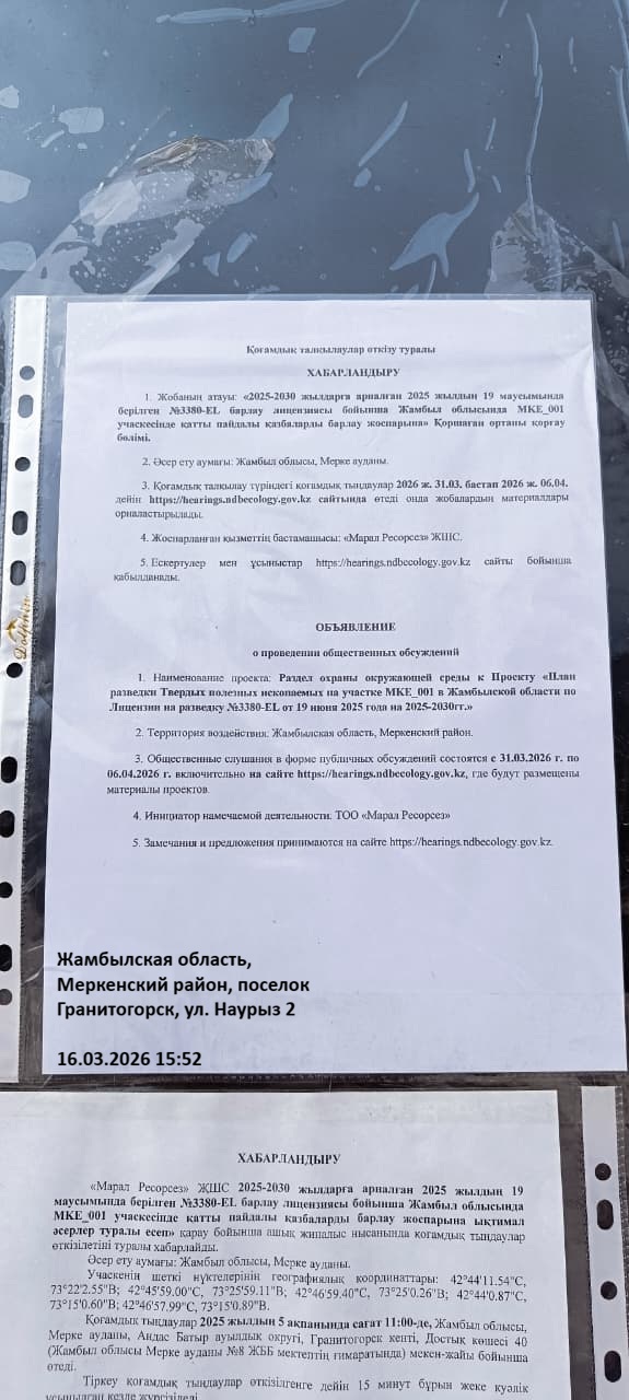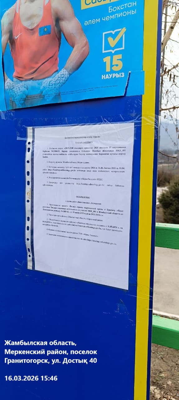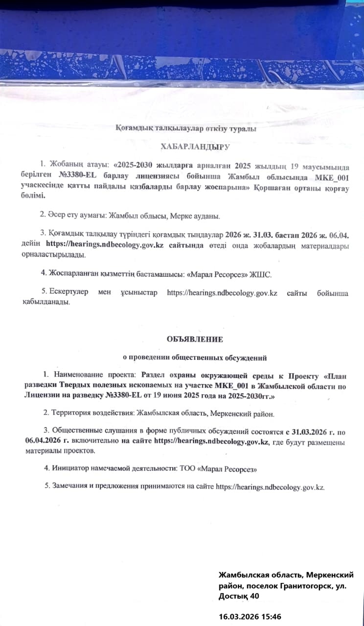 По проекту: Раздел охраны окружающей среды к Проекту «План разведки Твердых полезных ископаемых на участке MKE_001 в Жамбылской области по Лицензии на разведку №3380-EL от 19 июня 2025 года на 2025-2030гг.»