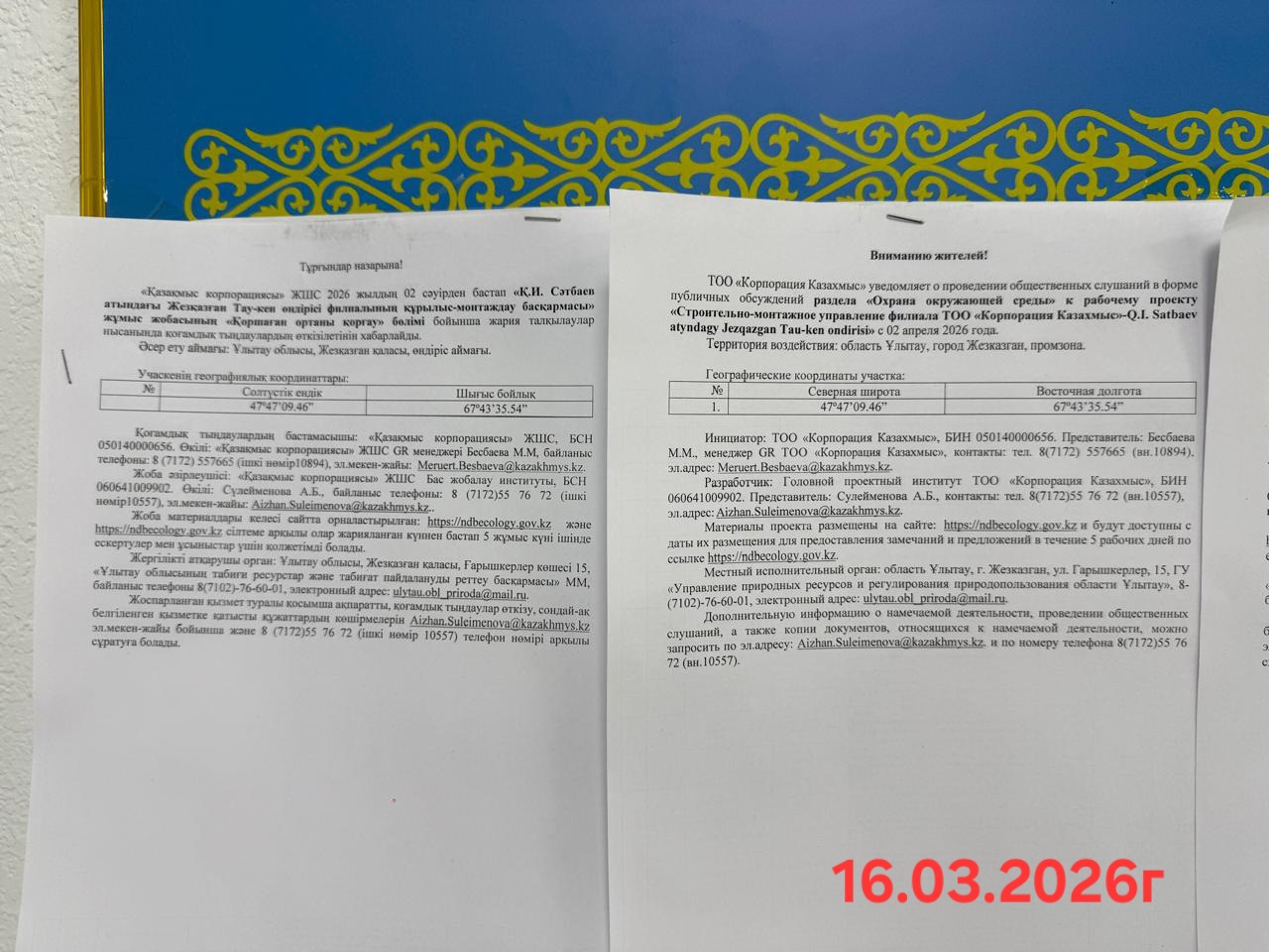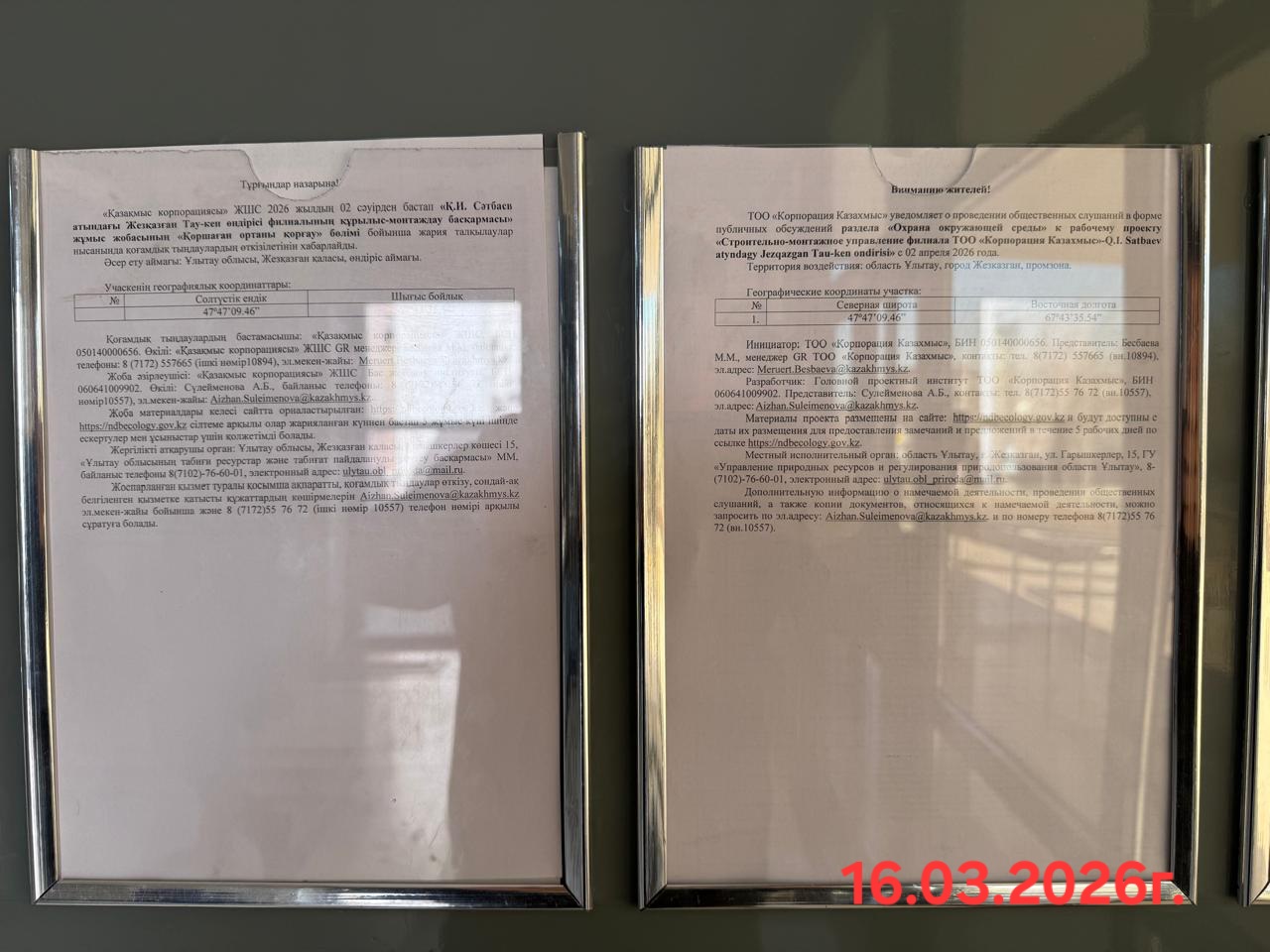По проекту: Раздел охраны окружающей среды для Строительно-монтажного управления филиала ТОО «Корпорация Казахмыс»- Q.I. Satbaev atyndagy Jezqazgan Tau-ken ondirisi