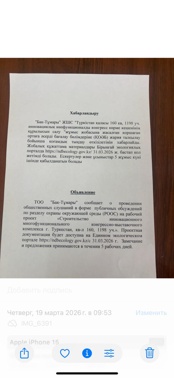 По проекту: «Строительство инновационного многофункционального конгрессно-выставочного комплекса г. Туркестан, кв-л 160, 1198 уч.»