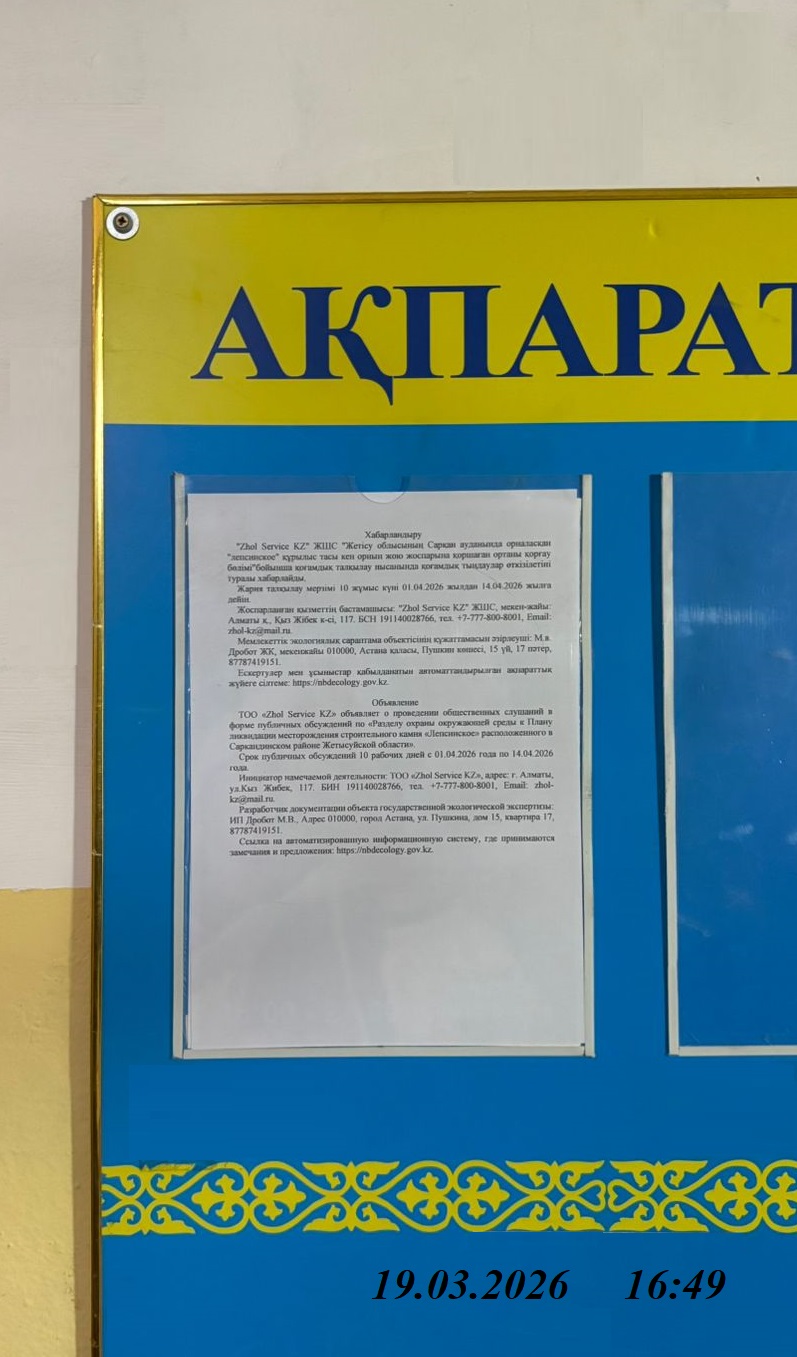 | 1 | область Жетісу, Саркандский район, Лепсинская п.а. |