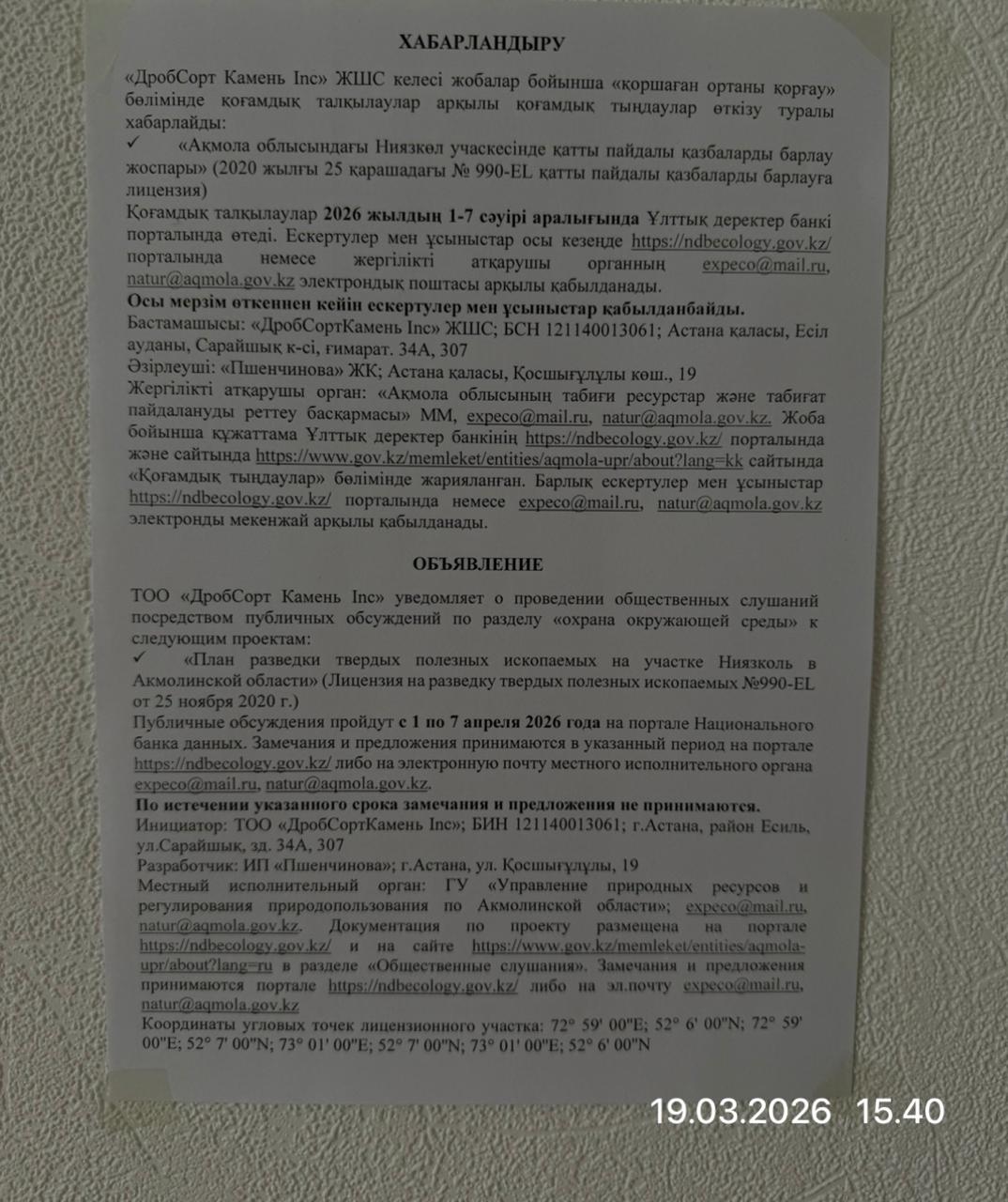 По проекту: Раздел «Охрана окружающей среды» в составе «План разведки твердых полезных ископаемых на участке Ниязколь в Акмолинской области» (Лицензия на разведку твердых полезных ископаемых №990-EL от 25 ноября 2020 г.)