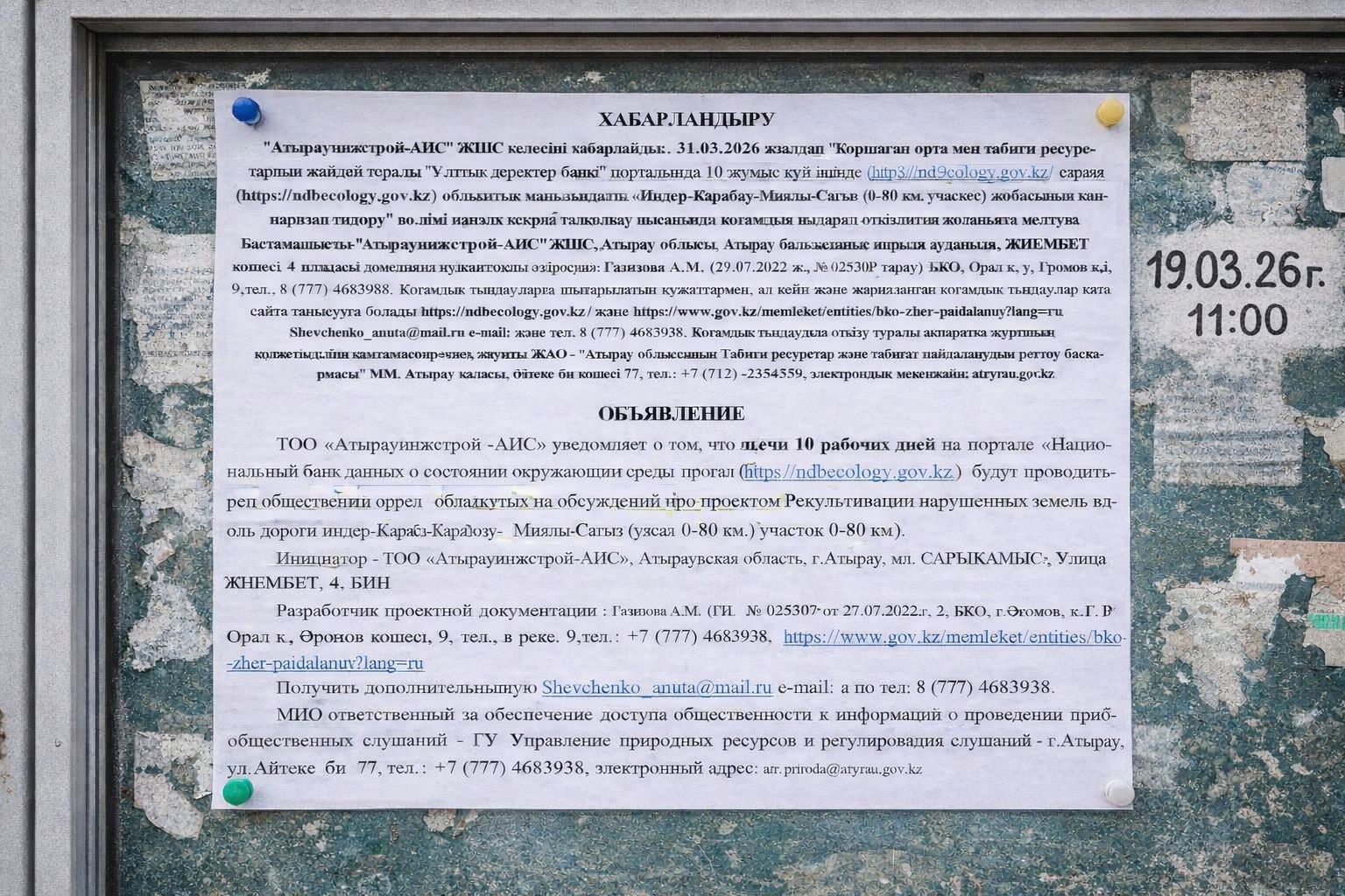 По проекту: Раздел «Охрана окружающей среды» к рабочему проекту: Рекультивация нарушенных земель вдоль автомобильной дороги областного значения Индер-Карабау-Миялы-Сагыз (участок 0-80 км).