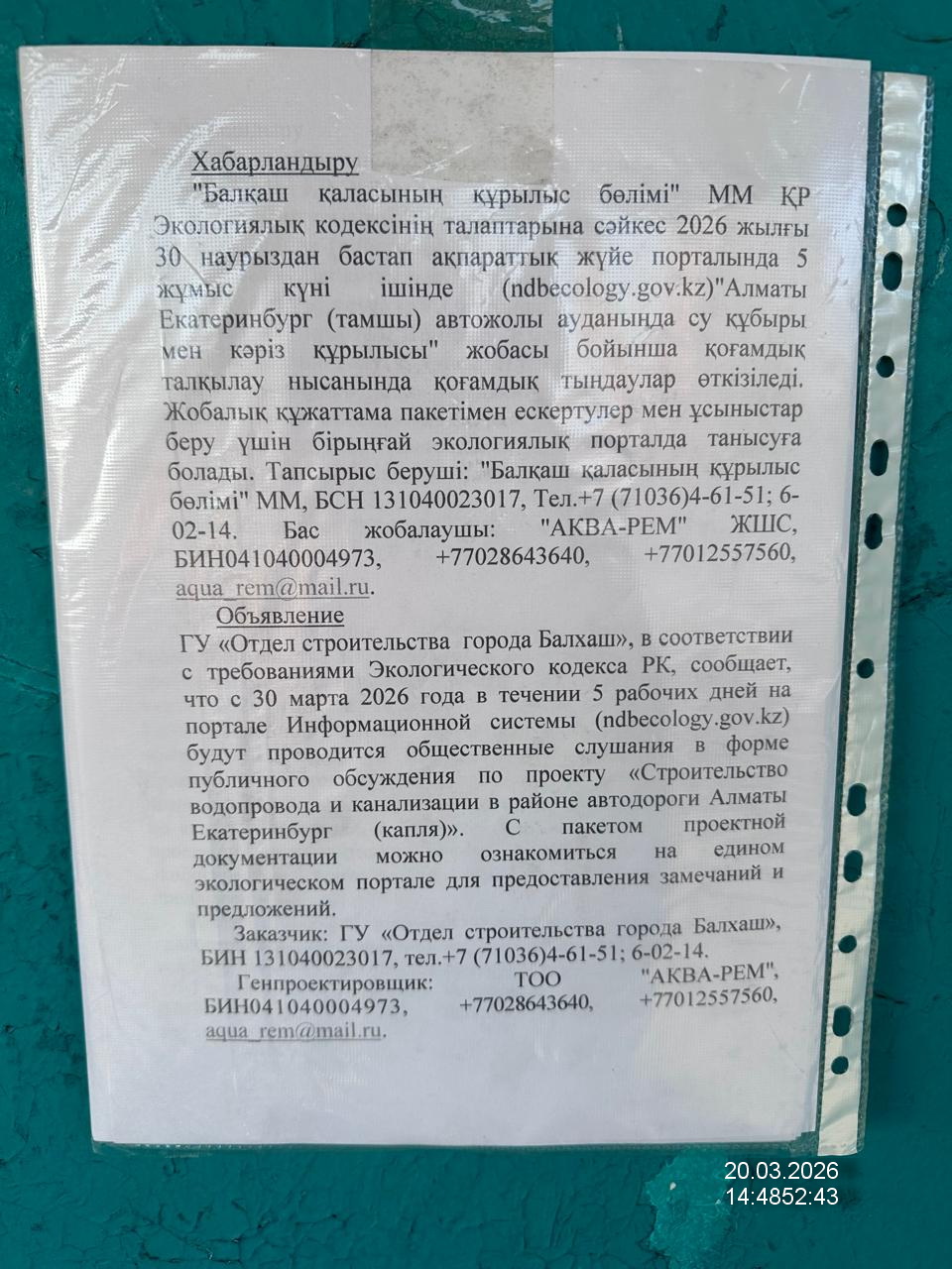 По проекту: Строительство водопровода и канализации в районе автодороги Алматы Екатеринбург (капля)
