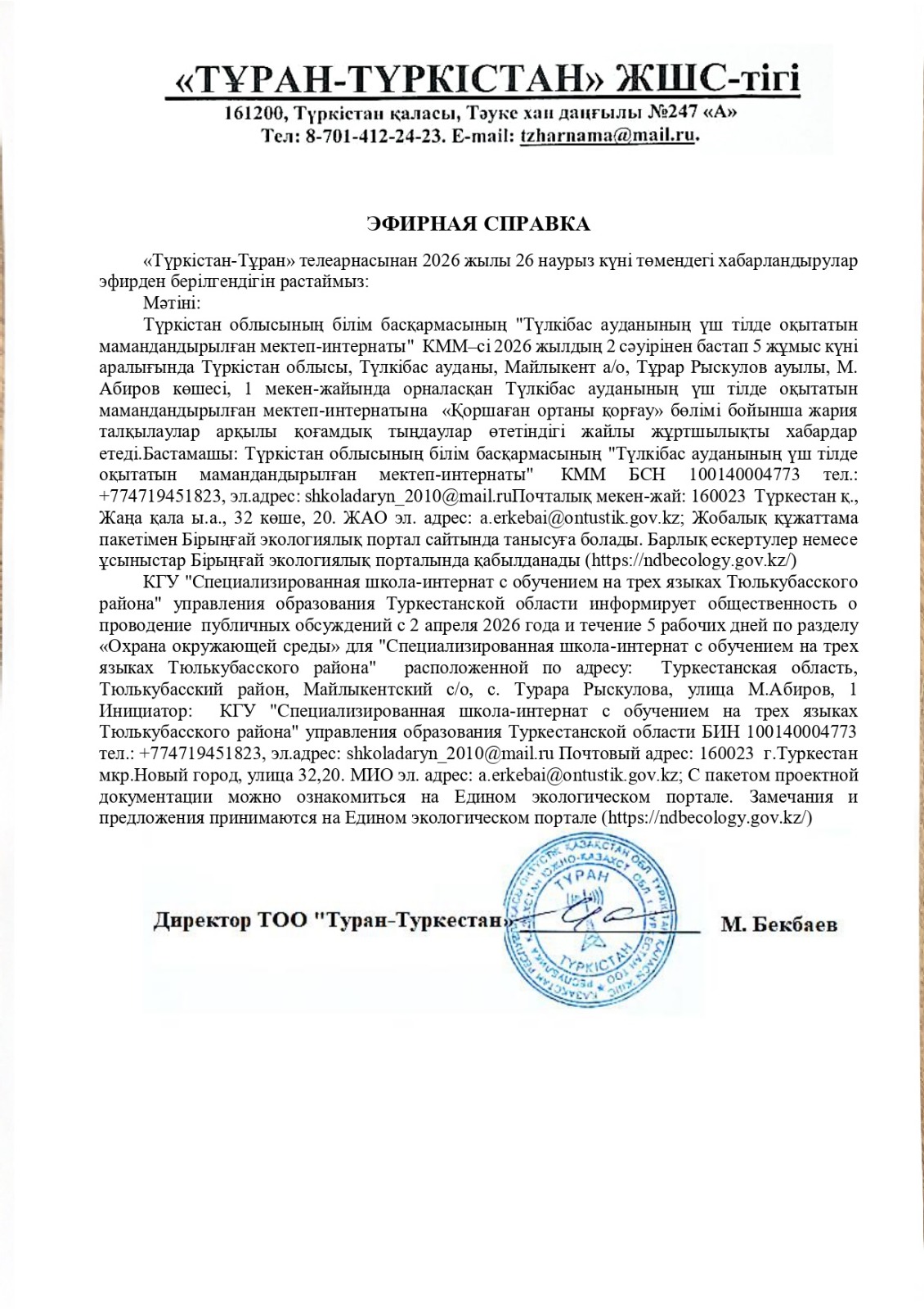 По проекту: РАЗДЕЛ «Охрана окружающей среды» для "Специализированная школа-интернат с обучением на трех языках Тюлькубасского района" расположенной по адресу: Туркестанская область, Тюлькубасский район, Майлыкентский с/о, с. Турара Рыскулова, улица М.Абиров, 1