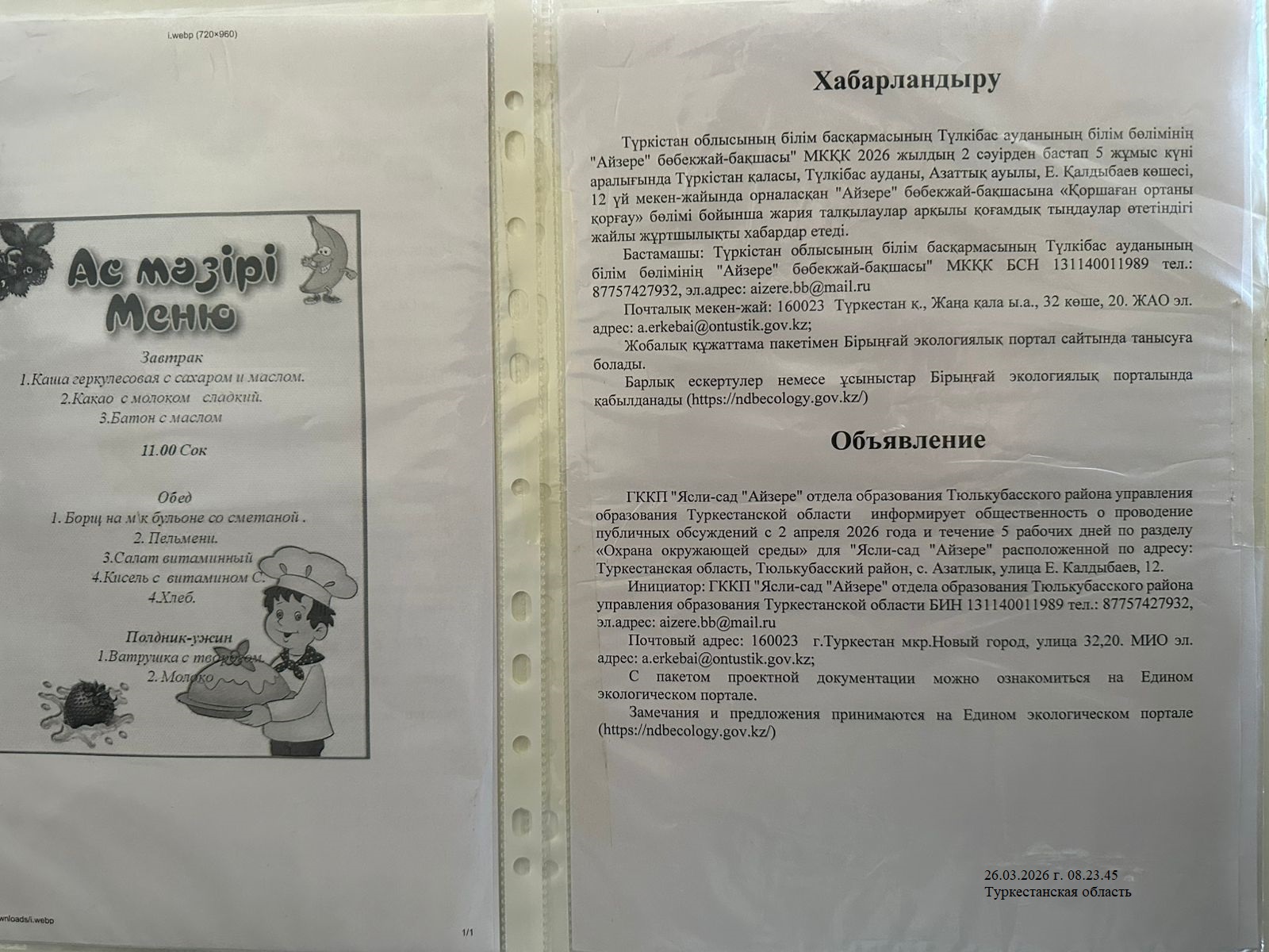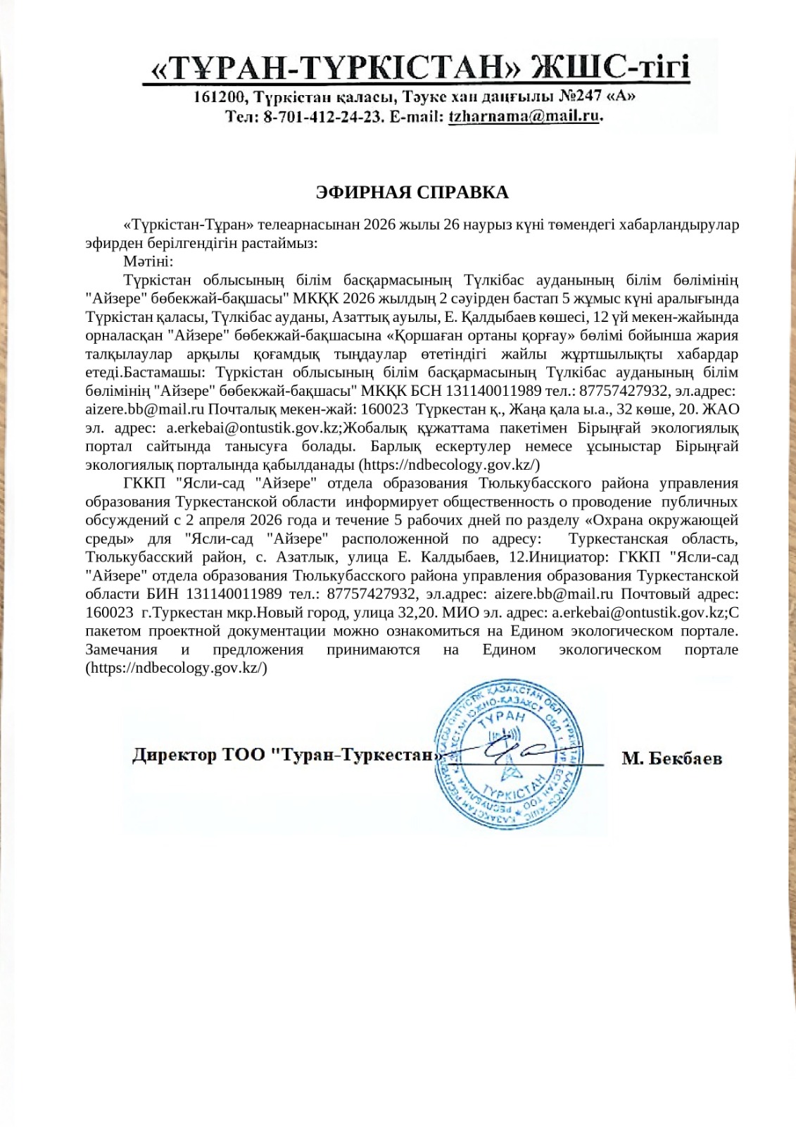 По проекту: РАЗДЕЛ «Охраны окружающей среды» для "Ясли-сад "Айзере" расположенной по адресу: Туркестанская область, Тюлькубасский район, с. Азатлык, улица Е. Калдыбаев, 12.